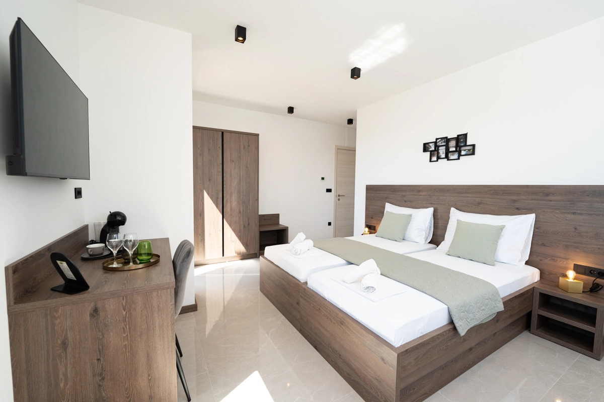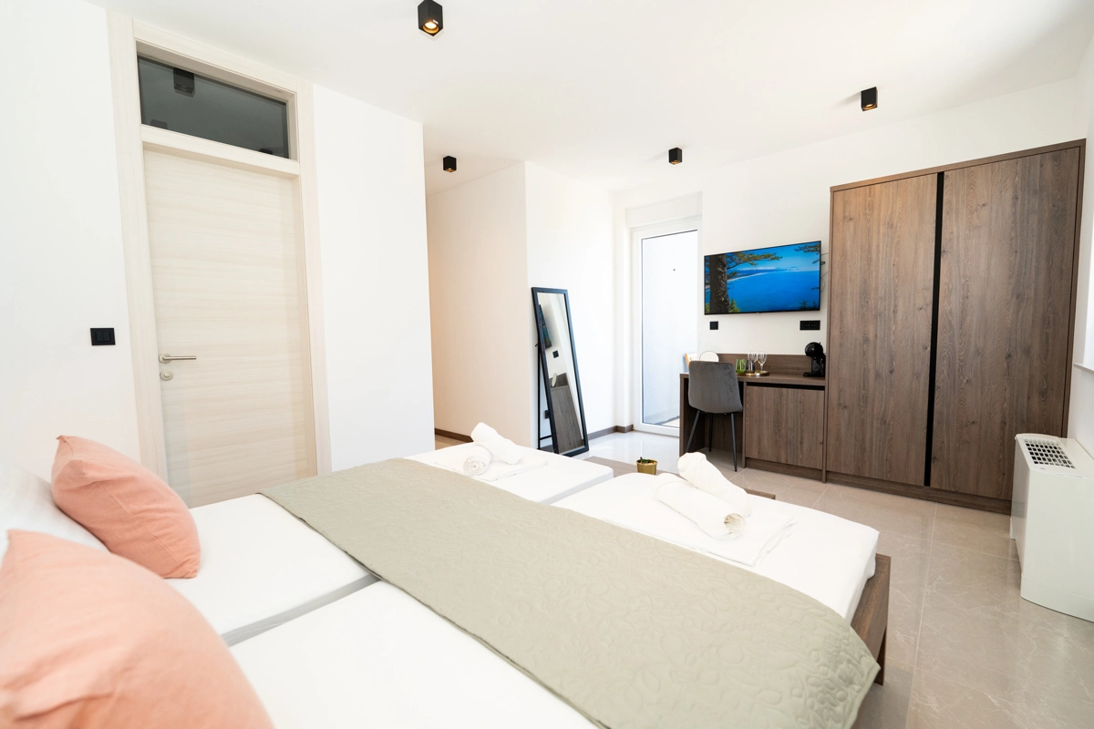 Goditi comfort e stile nelle nostre camere spaziose recentemente ristrutturate, ognuna dotata di balcone privato con vista mare totale o parziale. Ogni camera è progettata per il vostro relax e include un bagno privato moderno, arredi contemporanei e tutti i comfort necessari per un soggiorno piacevole. Che vi stiate svegliando con il suono delle onde o rilassando dopo una giornata di avventure, questa camera è il rifugio costiero perfetto.