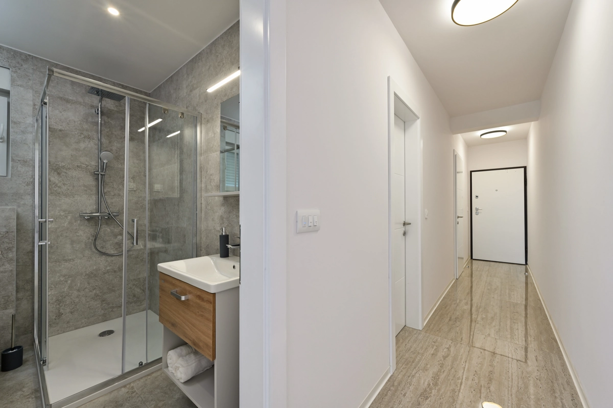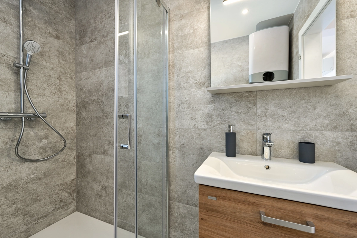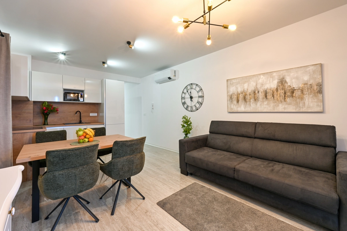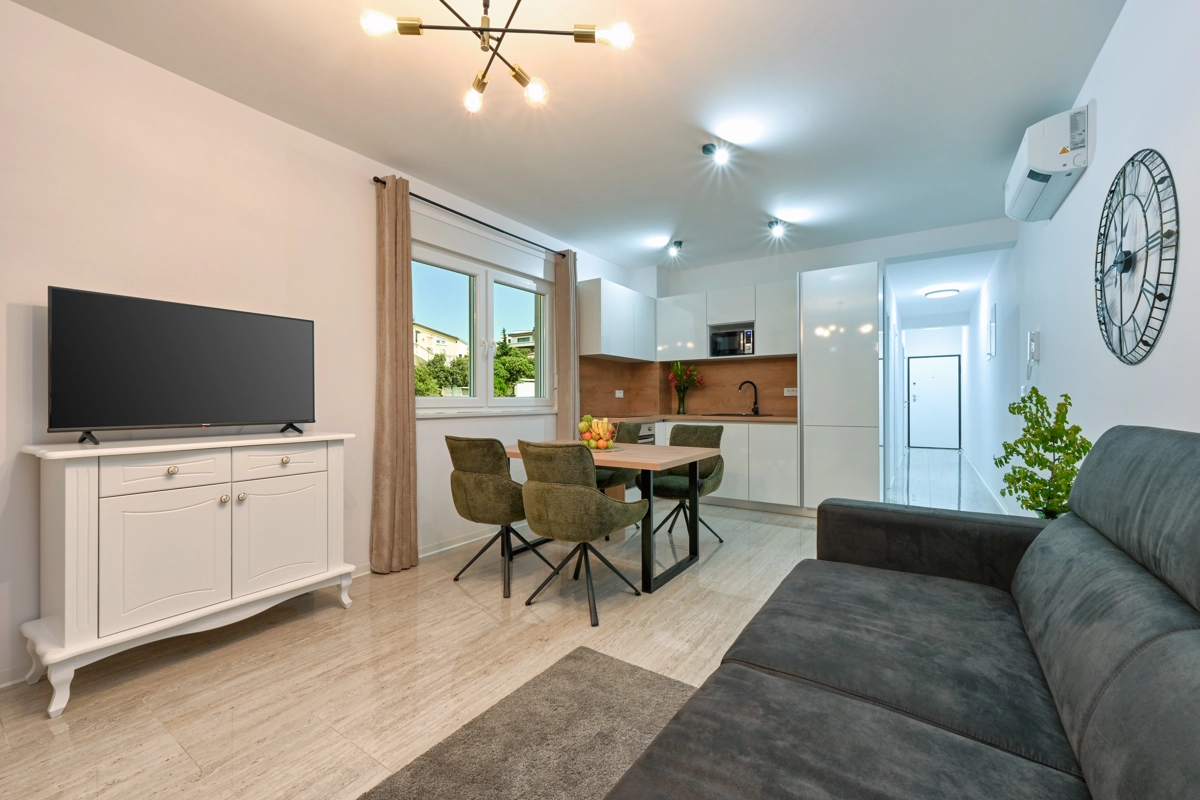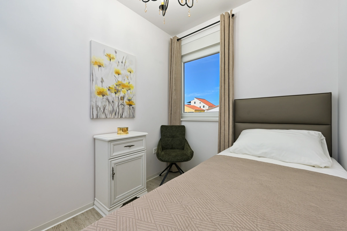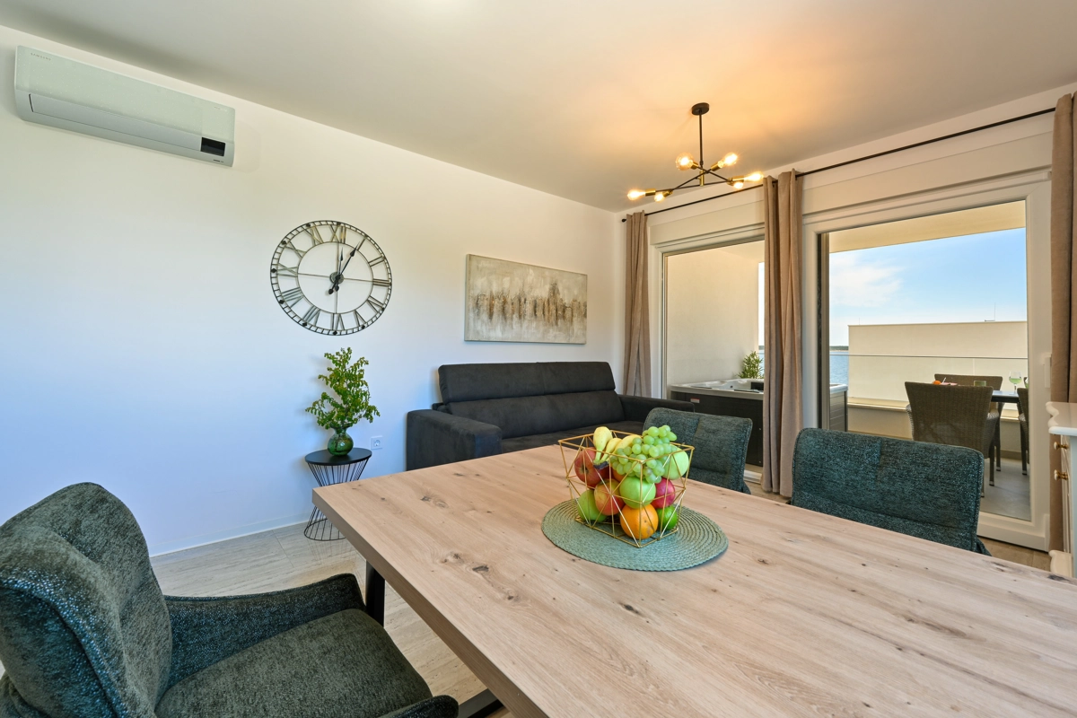 Dieses stilvolle Apartment im ersten Stock in Mandre verfügt über eine private Terrasse mit teilweisem Meerblick und einen eigenen Whirlpool – ideal zum Entspannen im Freien. Innen erwartet Sie ein modern eingerichteter Wohn- und Essbereich mit Küche, ein gemütliches Schlafzimmer und ein elegantes Bad. Der Strand ist nur wenige Gehminuten entfernt – perfekt für einen erholsamen Inselurlaub.