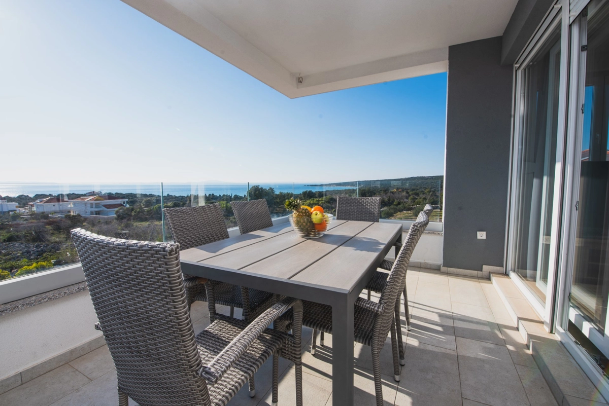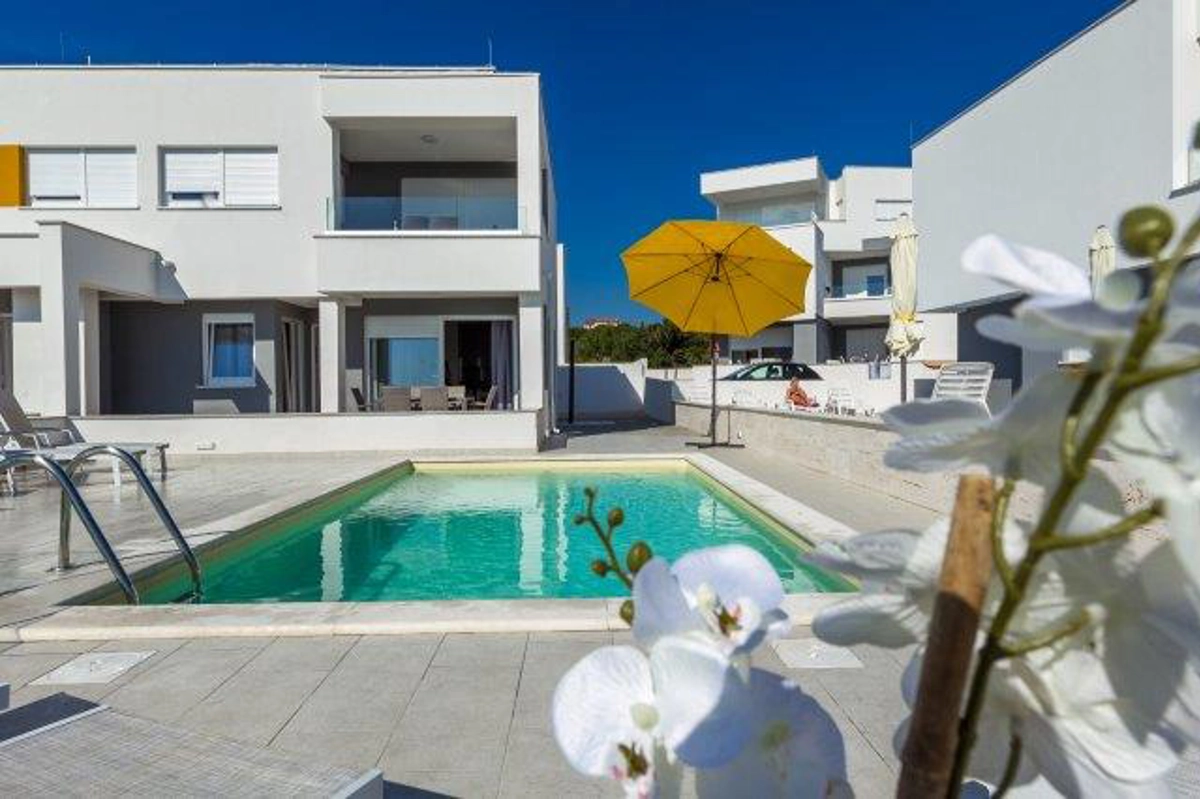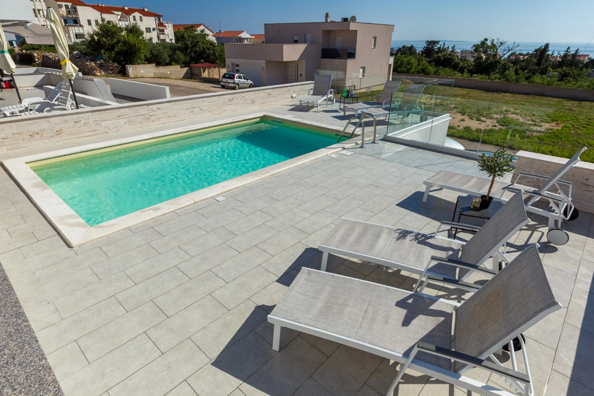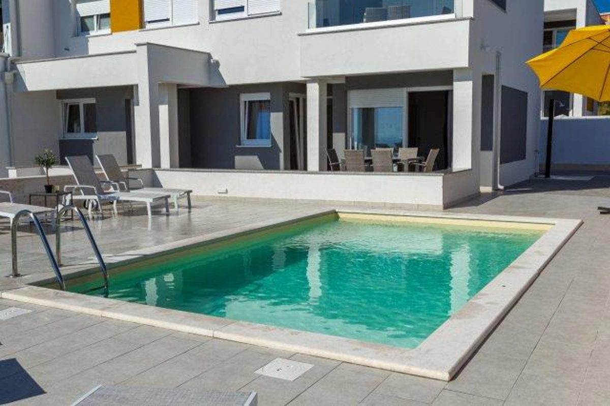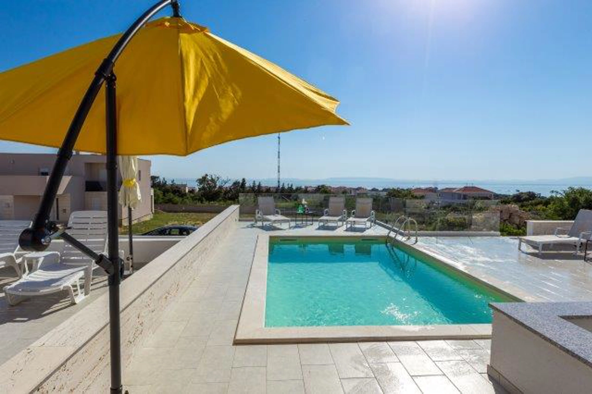Luxuriöse Villa mit Pool und Meerblick. Die Villa bietet 4 Apartments im modernen und luxuriösen Stil. Jedes Apartment von 65m2 verfügt über eine voll ausgestattete Küche, zwei Schlafzimmer, ein Badezimmer und ein zusätzliches WC, ein geräumiges Wohnzimmer und eine Terrasse mit Blick auf das Meer. Eine Bushaltestelle zum berühmten Strand Zrce erreichen Sie nach einem kurzen Spaziergang. In der Nähe befindet sich der Sandstrand Babe, der für die Wärme des Meeres und feinen Sand bekannt ist. Wir bieten kostenloses WLAN, Flachbild-TV, Bügeleisen und Haartrockner an. Es gibt auch einen Parkplatz vor der Villa. Der perfekte Ort, um am Pool auf einer Sonnenliege zu entspannen.