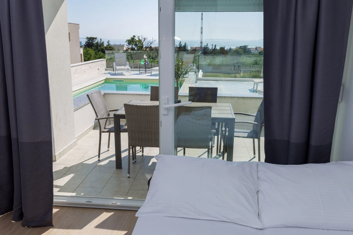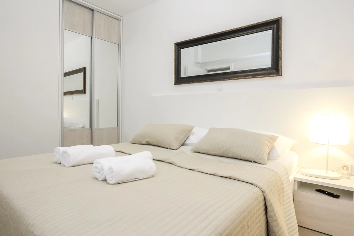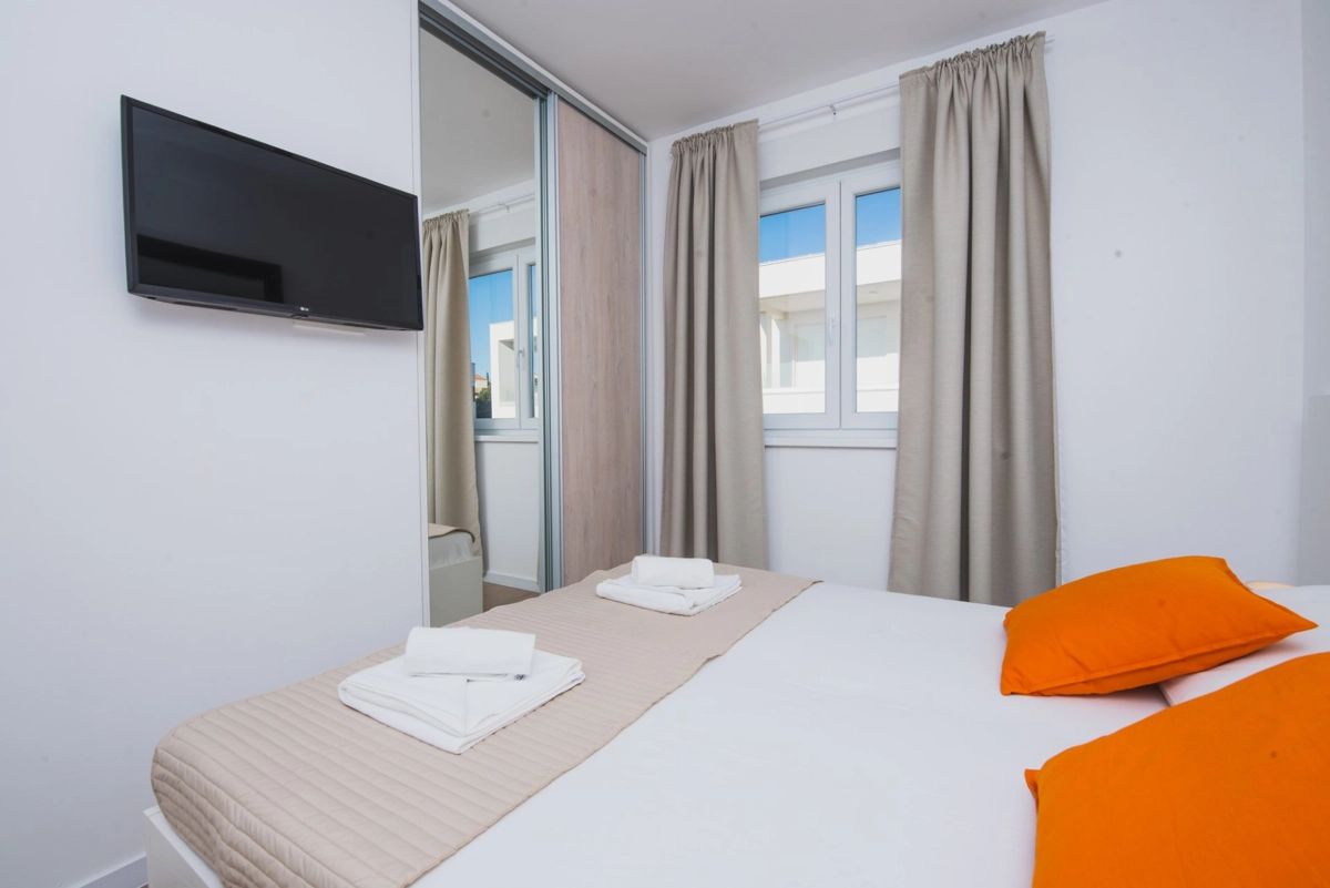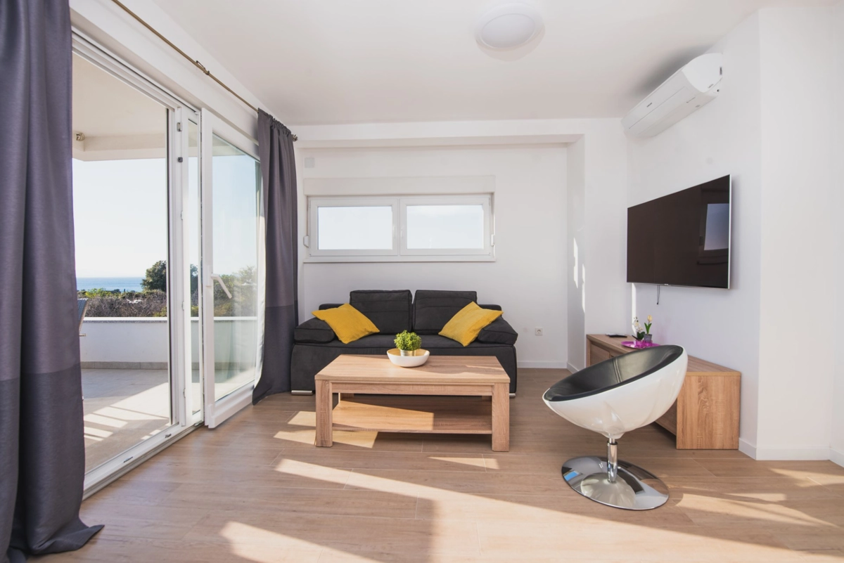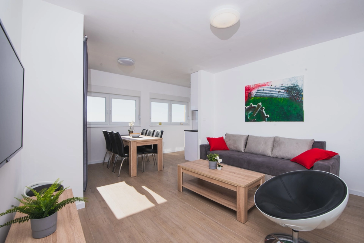 Luxuriöse Villa mit Pool und Meerblick. Die Villa bietet 4 Apartments im modernen und luxuriösen Stil. Jedes Apartment von 65m2 verfügt über eine voll ausgestattete Küche, zwei Schlafzimmer, ein Badezimmer und ein zusätzliches WC, ein geräumiges Wohnzimmer und eine Terrasse mit Blick auf das Meer. Eine Bushaltestelle zum berühmten Strand Zrce erreichen Sie nach einem kurzen Spaziergang. In der Nähe befindet sich der Sandstrand Babe, der für die Wärme des Meeres und feinen Sand bekannt ist. Wir bieten kostenloses WLAN, Flachbild-TV, Bügeleisen und Haartrockner an. Es gibt auch einen Parkplatz vor der Villa. Der perfekte Ort, um am Pool auf einer Sonnenliege zu entspannen.