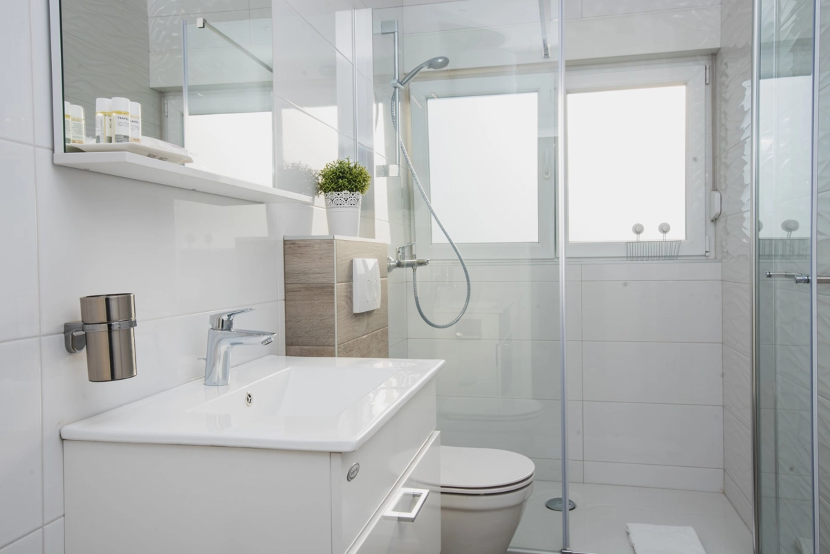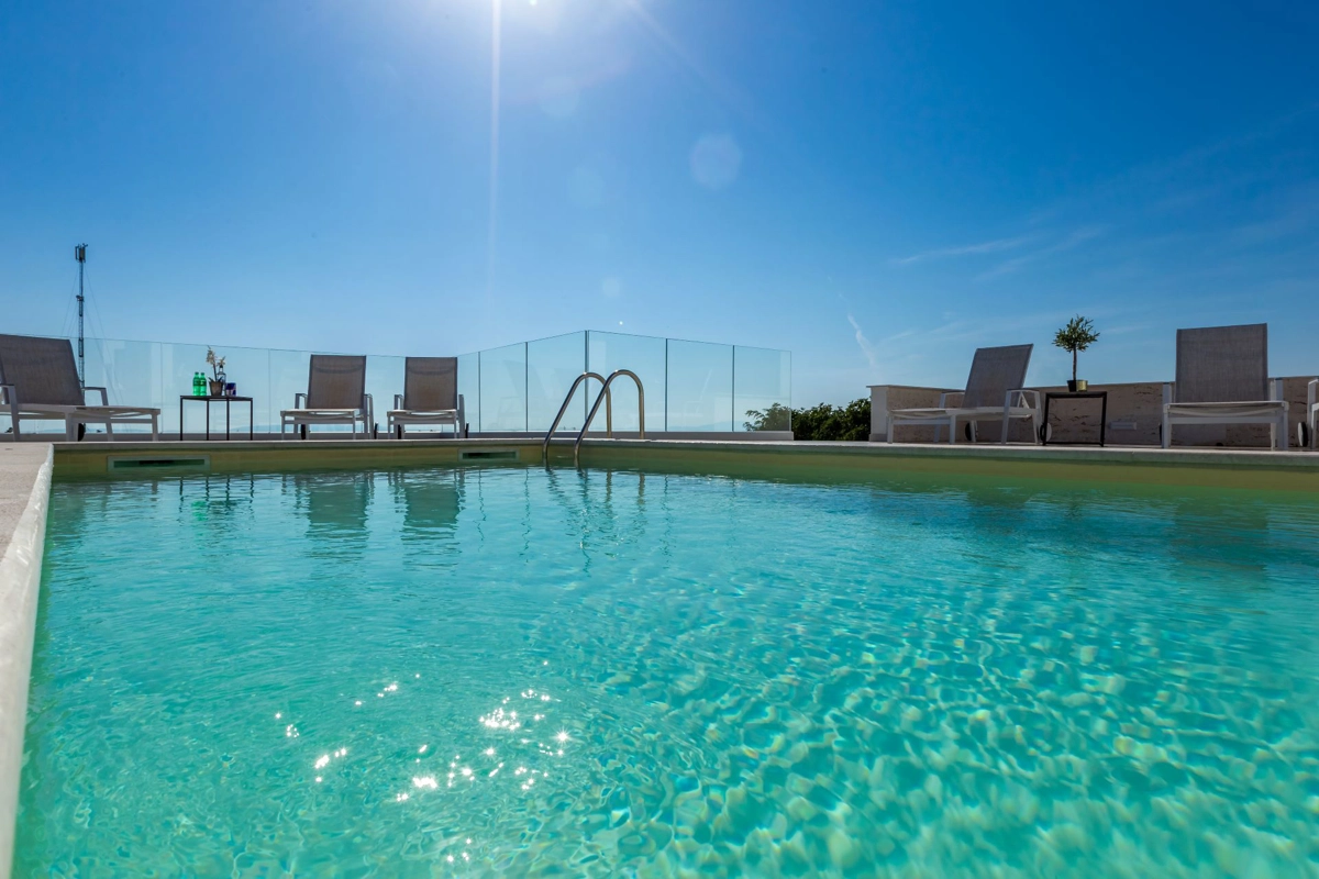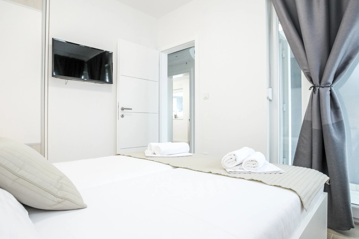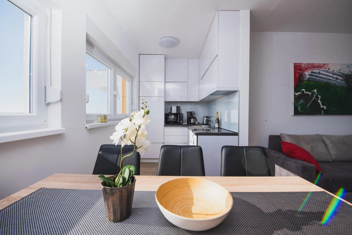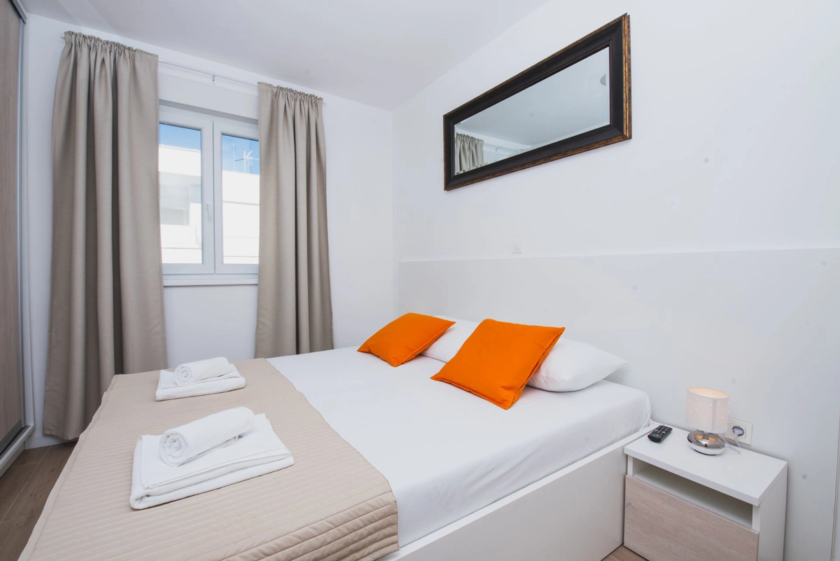 Luxuriöse Villa mit Pool und Meerblick. Die Villa bietet 4 Apartments im modernen und luxuriösen Stil. Jedes Apartment von 65m2 verfügt über eine voll ausgestattete Küche, zwei Schlafzimmer, ein Badezimmer und ein zusätzliches WC, ein geräumiges Wohnzimmer und eine Terrasse mit Blick auf das Meer. Eine Bushaltestelle zum berühmten Strand Zrce erreichen Sie nach einem kurzen Spaziergang. In der Nähe befindet sich der Sandstrand Babe, der für die Wärme des Meeres und feinen Sand bekannt ist. Wir bieten kostenloses WLAN, Flachbild-TV, Bügeleisen und Haartrockner an. Es gibt auch einen Parkplatz vor der Villa. Der perfekte Ort, um am Pool auf einer Sonnenliege zu entspannen.