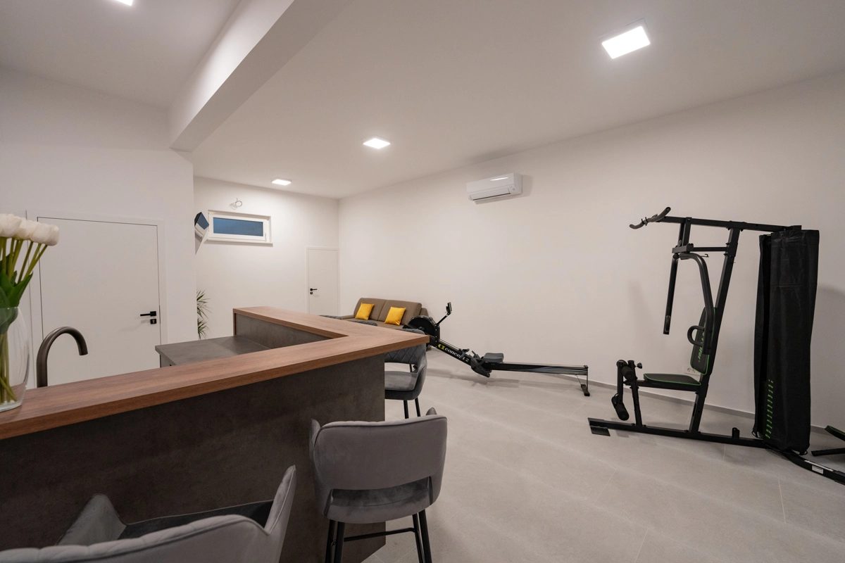 Der großzügige Wohnbereich öffnet sich zu einer großen Terrasse, die atemberaubende Ausblicke auf die umliegende Landschaft bietet – der perfekte Ort zum Entspannen oder Unterhalten. Der private beheizte Pool ist eine einladende Oase, die ganzjährig genutzt werden kann, während die angrenzende Sauna einen ruhigen Rückzugsort für ultimative Entspannung verspricht. Für diejenigen, die aktiv bleiben möchten, bietet die Villa zudem ein gut ausgestattetes Mini-Fitnessstudio mit modernen Fitnessgeräten.