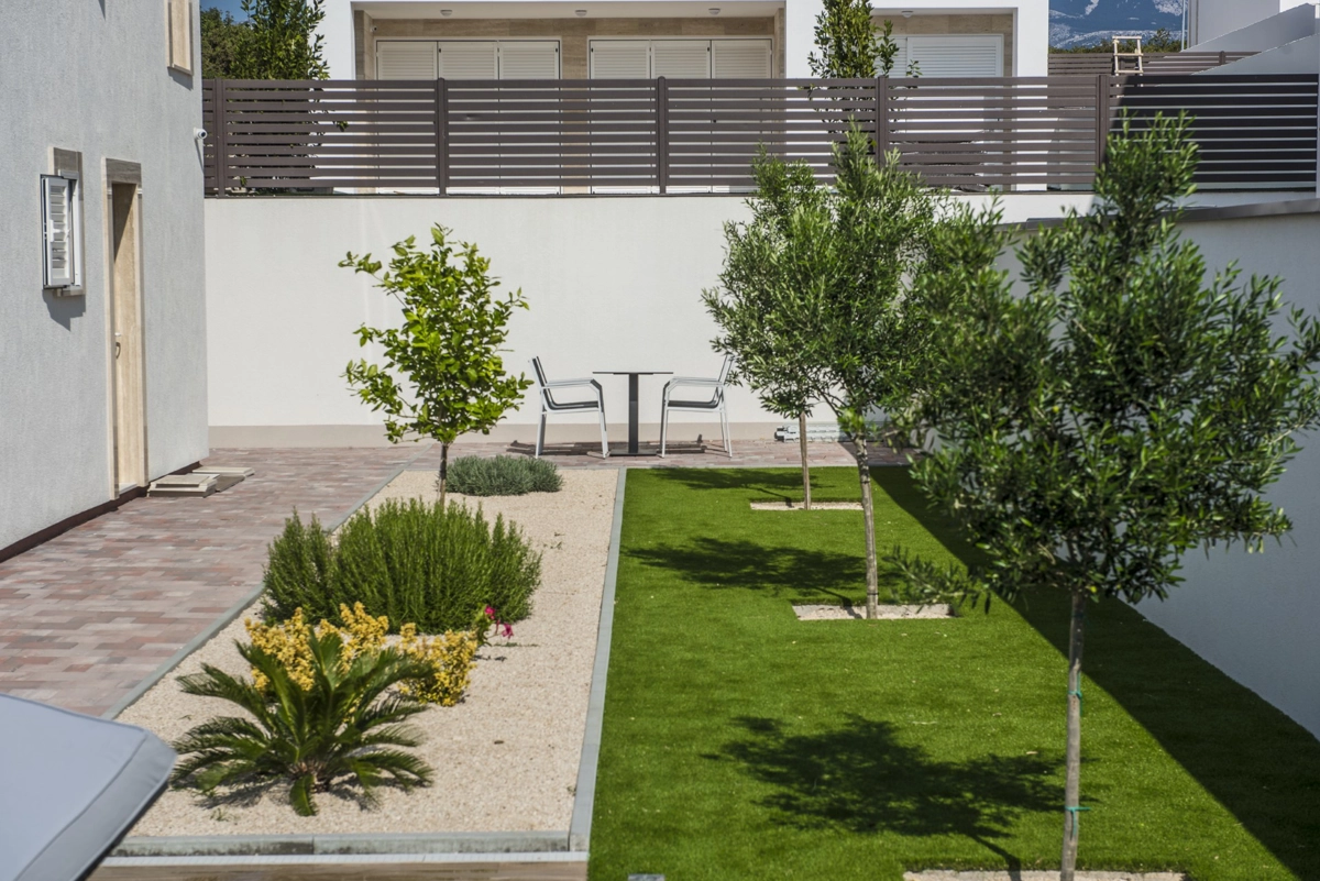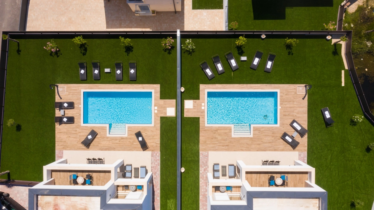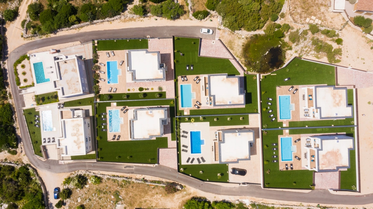 Moderna i vrhunski uređena vila, s površinom od 200 m², pruža smještaj za osam osoba. Svaka vila raspolaže s četiri prostrane, potpuno klimatizirane spavaće sobe s balkonima. Dvije su opremljene bračnim krevetom, dok druge dvije imaju dva odvojena kreveta koji se po potrebi mogu spojiti. Vila ima tri kupaonice, jedna en suite, a sve su opremljene tuš-kabinama. Prostrano prizemlje vile otvorenog je plana: moderno uređen dnevni boravak povezan je s potpuno opremljenom kuhinjom i blagovaonicom. Sve to upotpunjuje predivan pogled i izravan izlaz na prostranu terasu sa sunčalištem i bazenom. Terasu krasi vanjska blagovaonica s roštiljem uz koji se možete opustiti u ugodnom društvu. Zemljište od 600 m² ograđeno je dijelom kamenim zidom ili metalnom ogradom i pružit će vam privatnost te ćete moći neometano uživati u vašem odmoru. Osigurana su vam najmanje 3 parkirna mjesta.