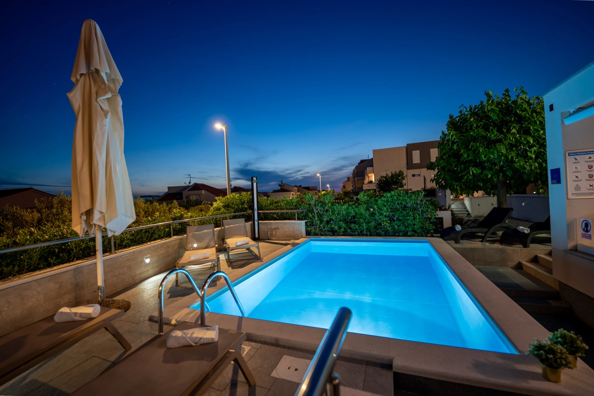 Gli appartamenti di lusso Villa Zora vi offriranno tutto ciò che cercate a Novalja e sono progettati per una vacanza perfetta. Si trovano a 10 minuti a piedi dalla spiaggia, dal centro città e dalla stazione degli autobus per la famosa spiaggia di Zrće. La villa dispone di tre appartamenti ed è fantastica se siete un gruppo più numeroso che gode dell'estate e desidera una certa privacy. Tutti gli appartamenti sono arredati in stile moderno con ampie terrazze e servizi di cui avrete bisogno durante il vostro soggiorno. È un dei pochi alloggi con una piscina riscaldata per aver un top comfort. Vi abbiamo fornito un parcheggio gratuito in loco e la connessione Wi-Fi.