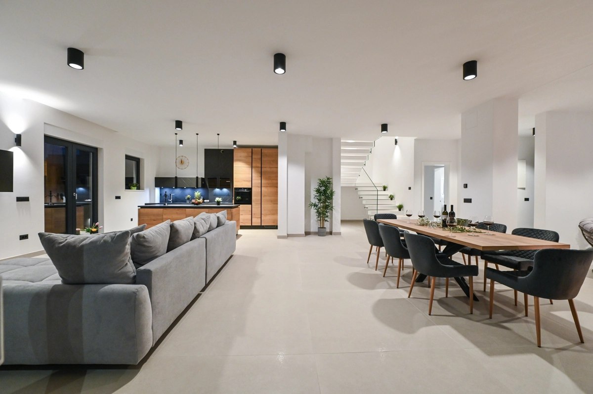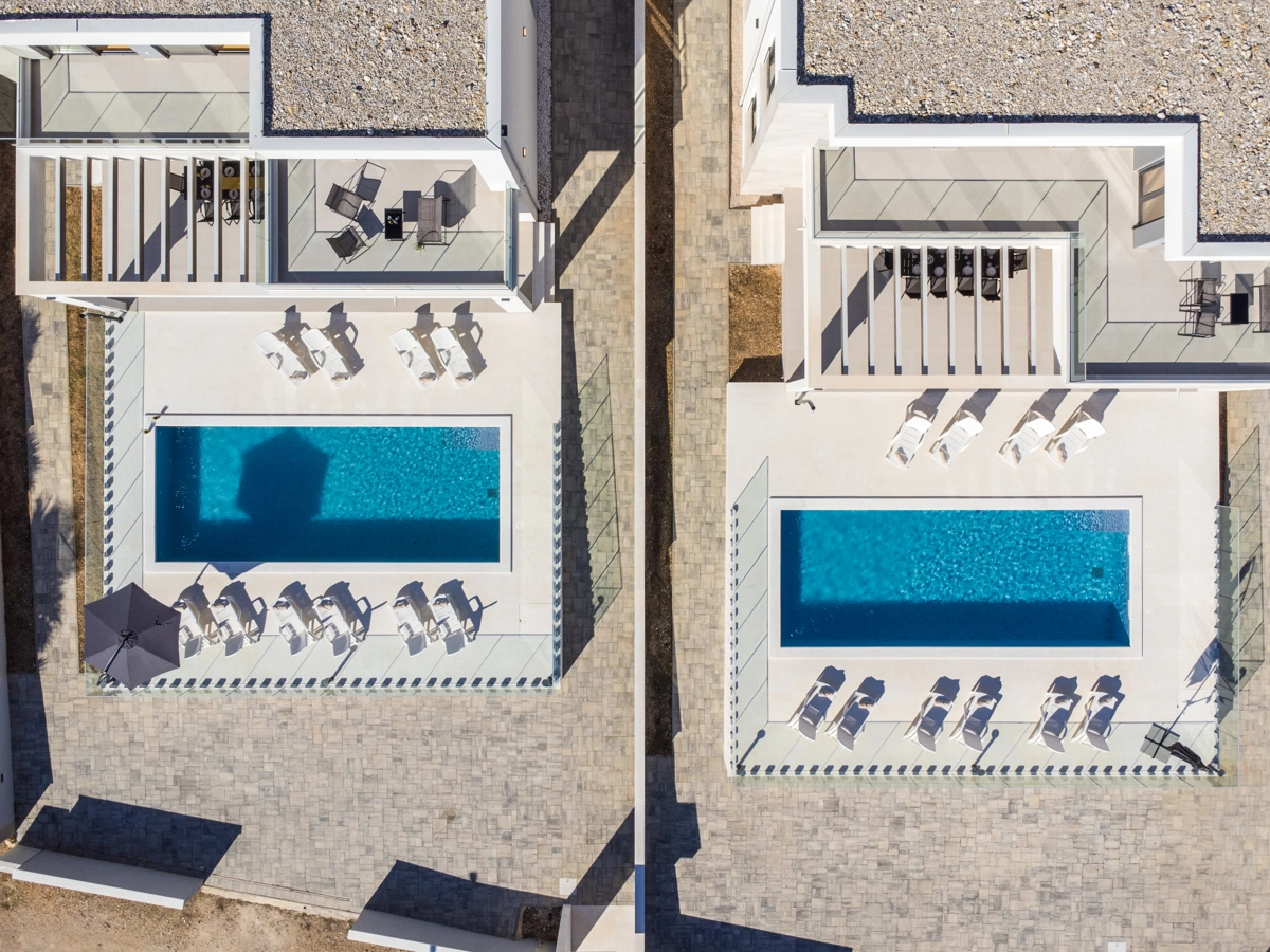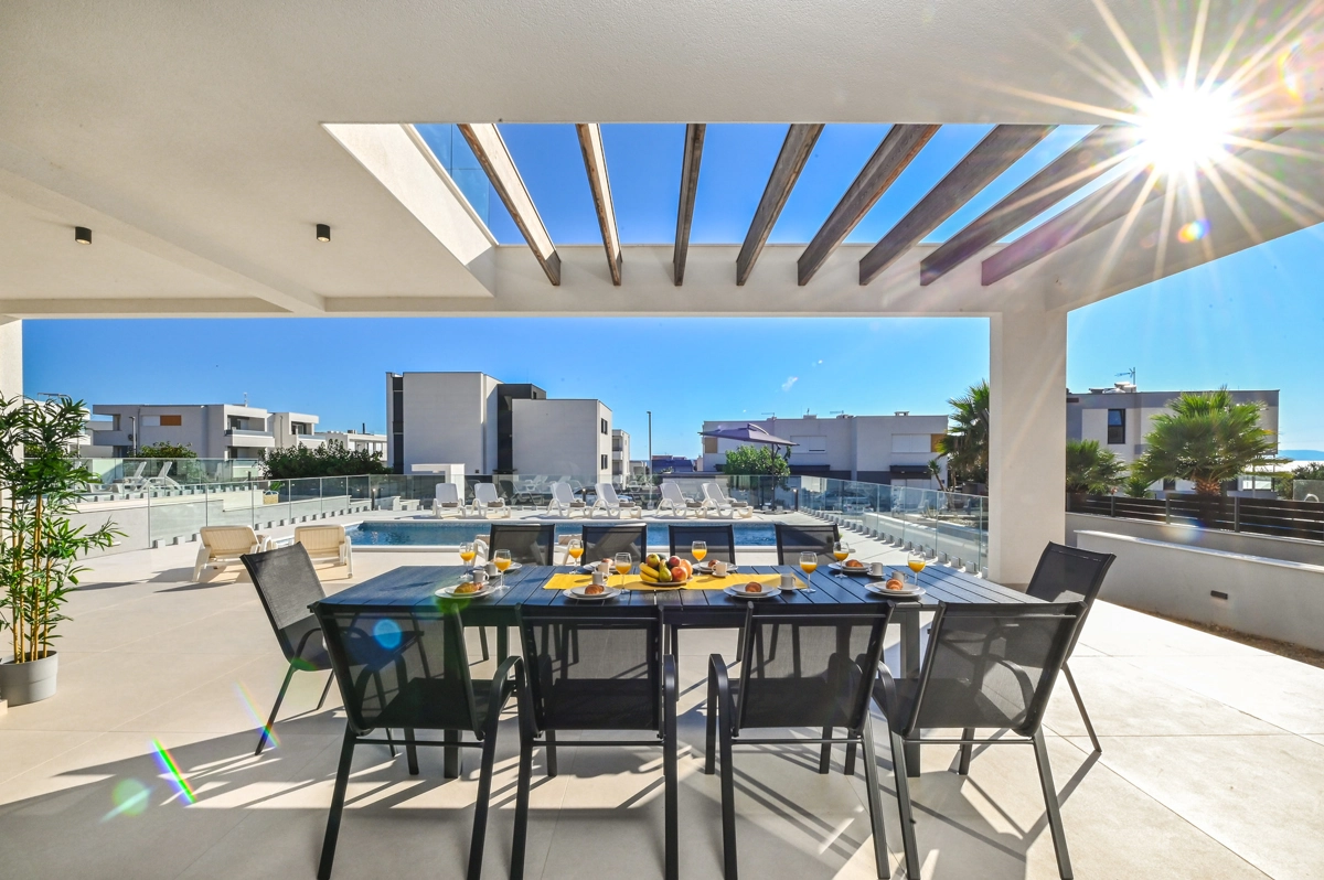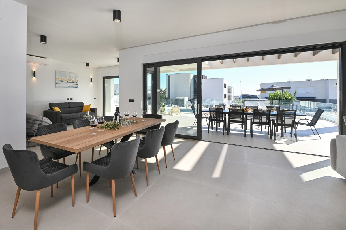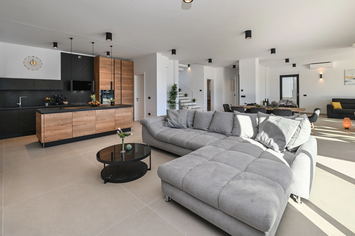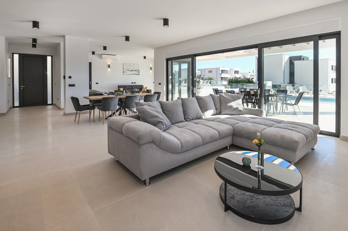 L'area living comprende una cucina completamente attrezzata e una zona pranzo. Grandi porte in vetro conducono a una splendida terrazza solarium e a un giardino, dove la piscina privata invita a rilassarsi e rinfrescarsi.