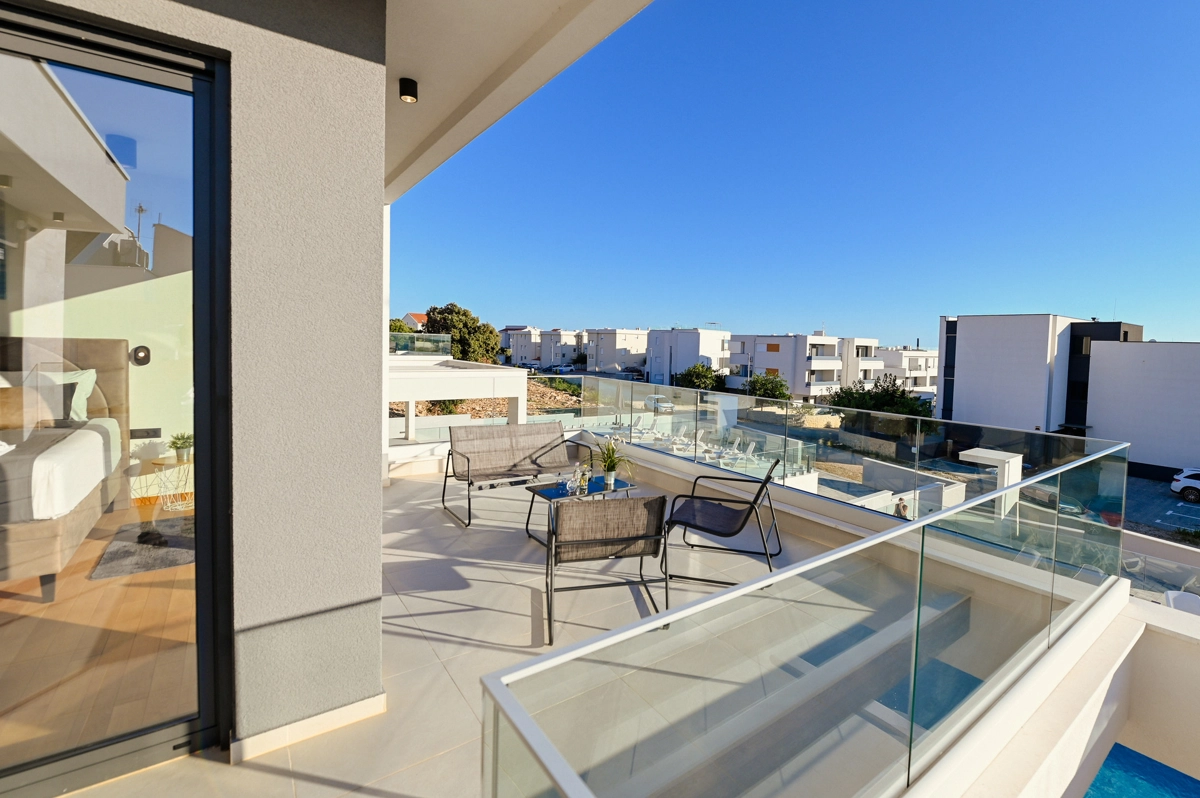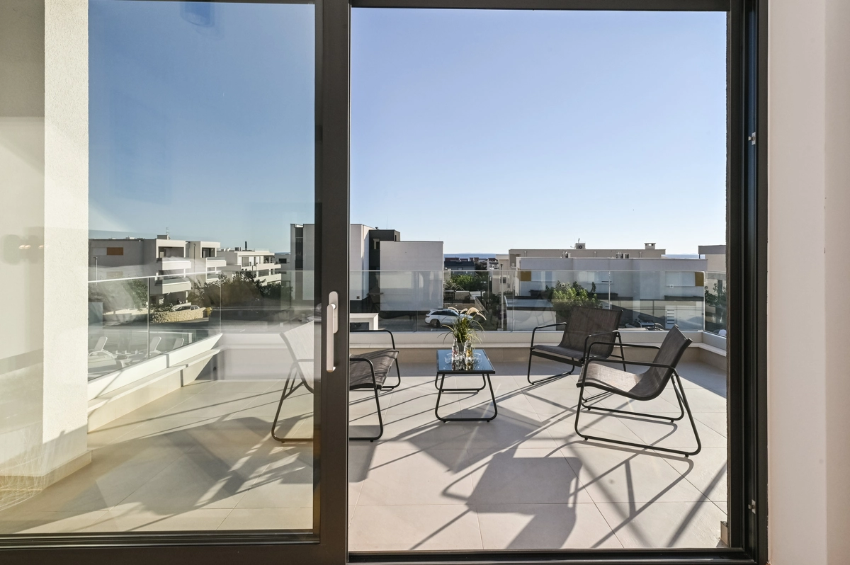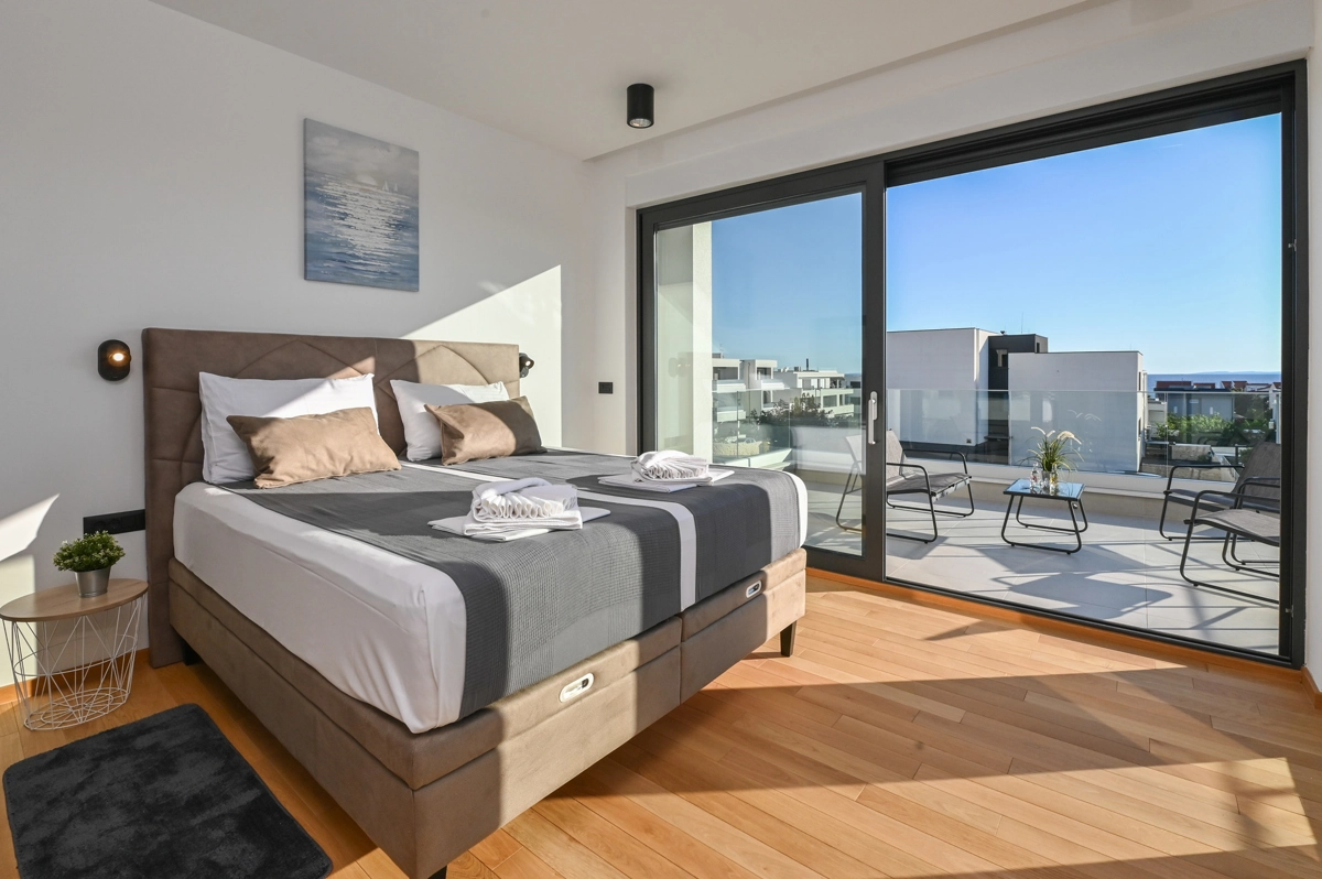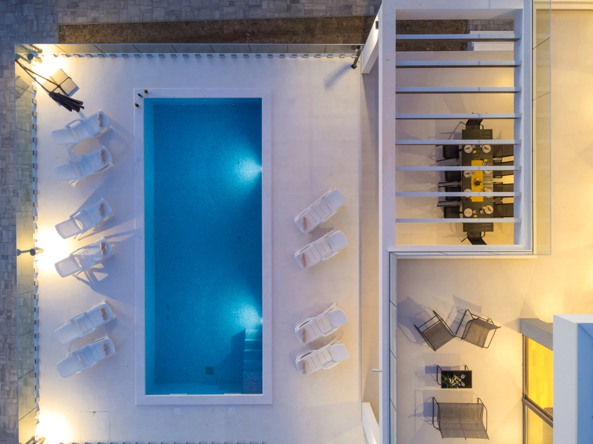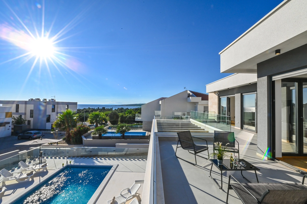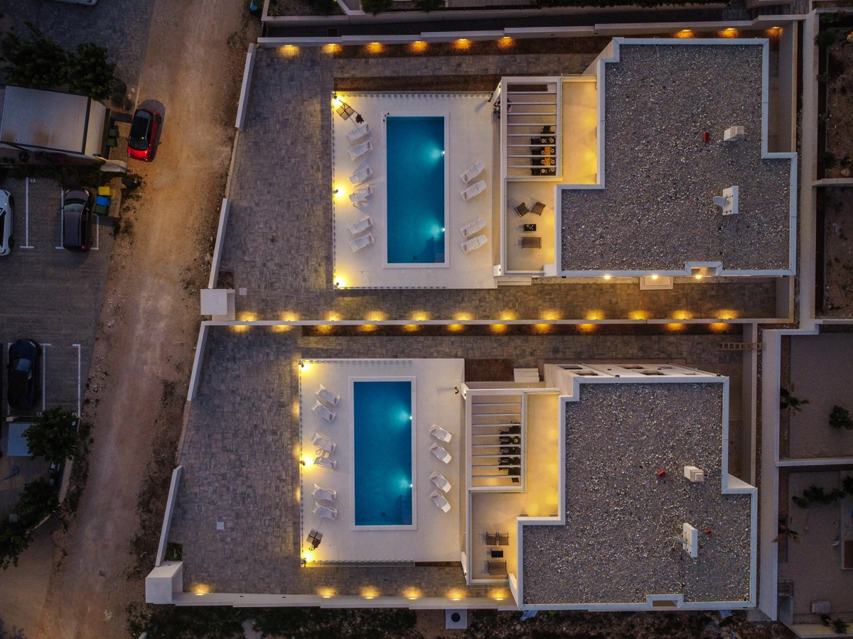 L'area living comprende una cucina completamente attrezzata e una zona pranzo. Grandi porte in vetro conducono a una splendida terrazza solarium e a un giardino, dove la piscina privata invita a rilassarsi e rinfrescarsi.