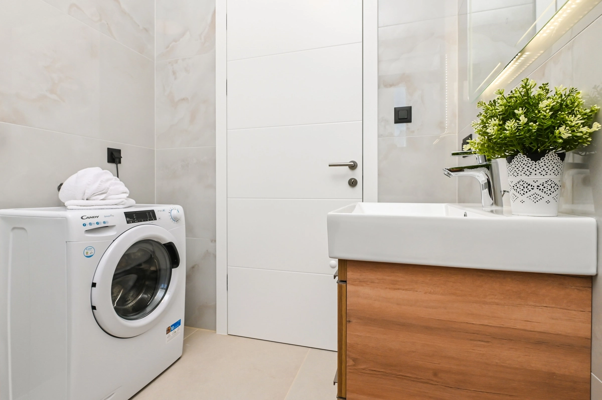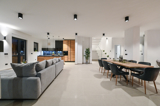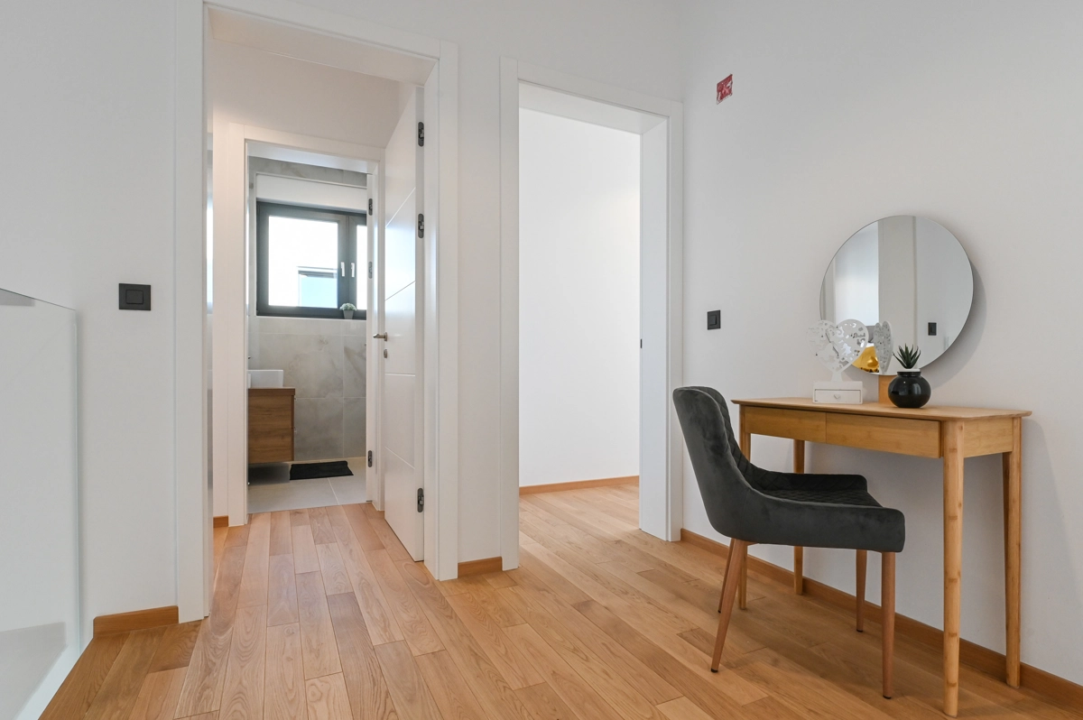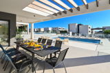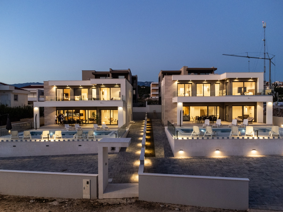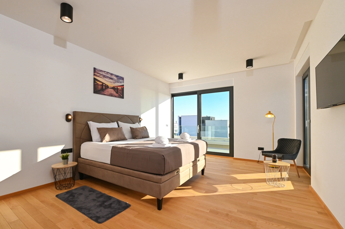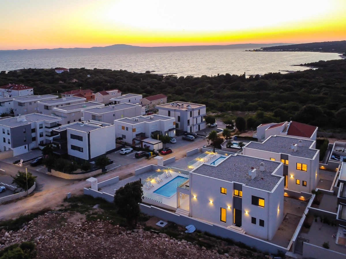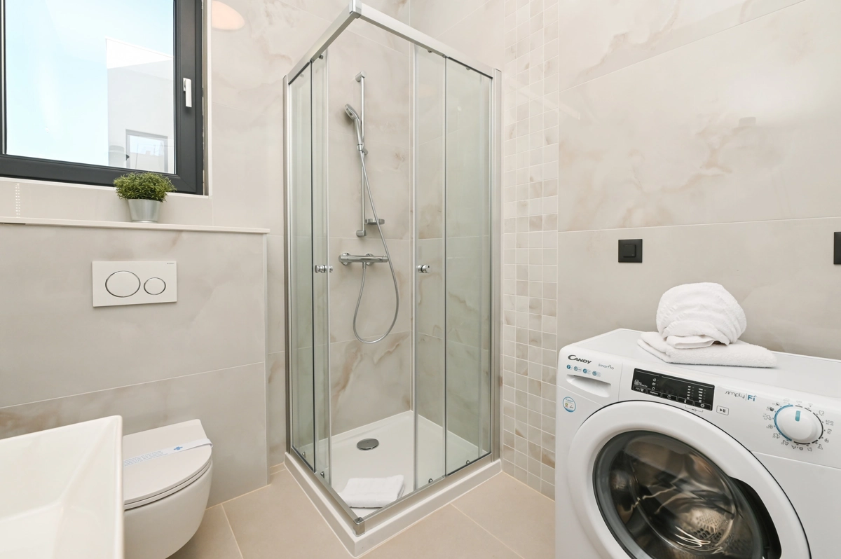 L'area living comprende una cucina completamente attrezzata e una zona pranzo. Grandi porte in vetro conducono a una splendida terrazza solarium e a un giardino, dove la piscina privata invita a rilassarsi e rinfrescarsi.