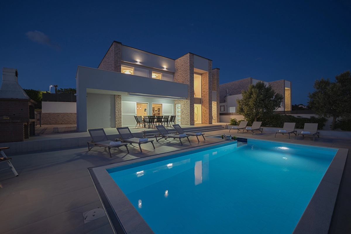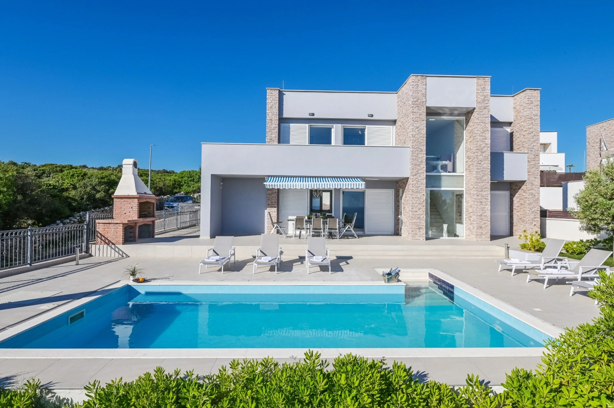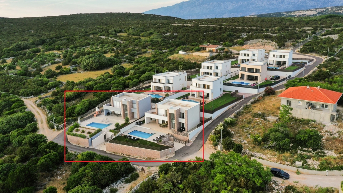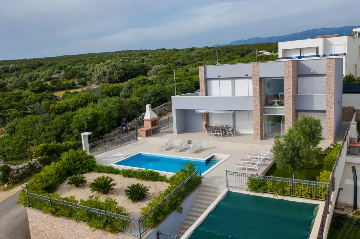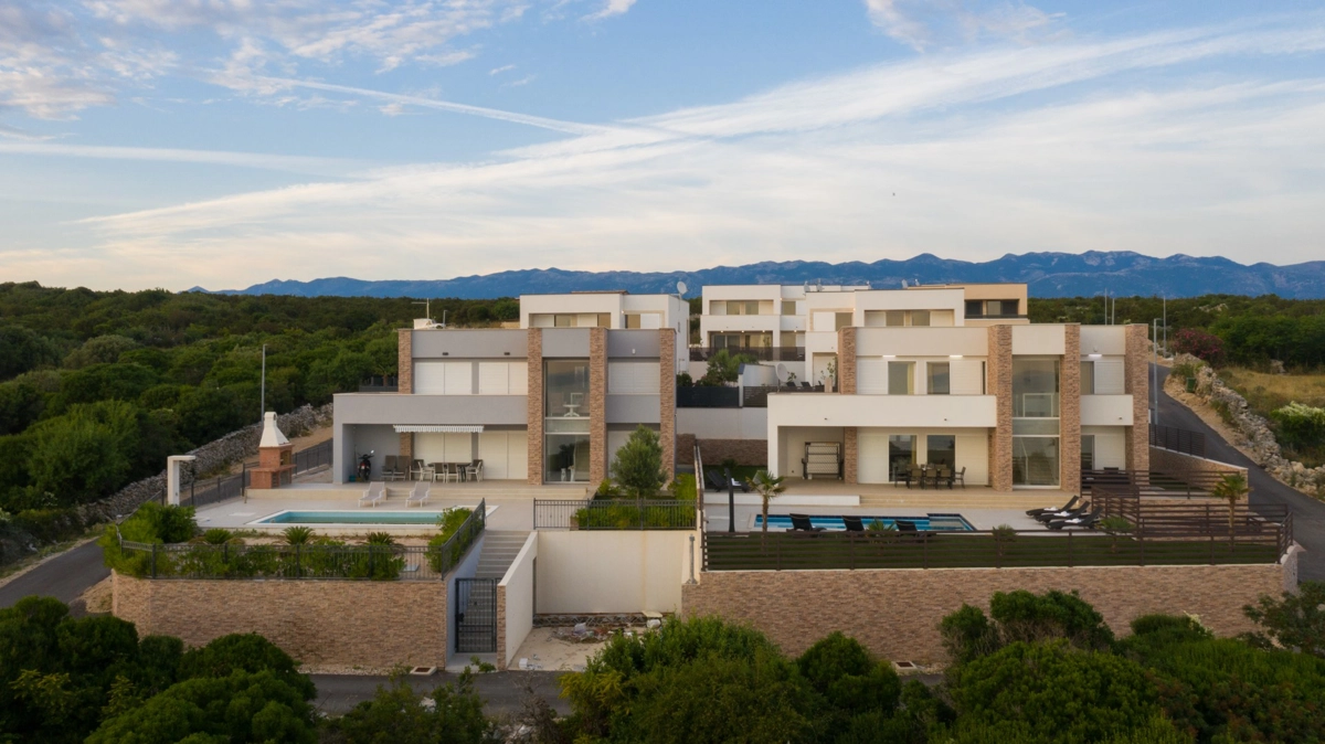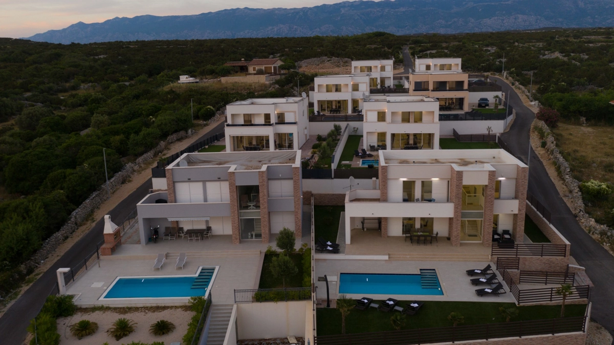 Se volete godervi il lusso e il comfort, Villas Royal sono la scelta giusta per voi. Un bellissimo panorama mozzafiato vi assicurerà una vacanza da ricordare. Villa moderna e superbamente decorata, con una superficie di 200 m2, offre alloggio per otto persone. Ogni villa dispone di quattro camere da letto spaziose, con aria condizionata e balcone. Due sono dotate di letto matrimoniale, mentre le altre due hanno due letti singoli che all'occorrenza possono unirsi. La villa dispone di tre bagni, uno en-suite, mentre tutti i bagni sono dotati di doccia. L'ampio piano terra della villa è fatto in modo open space, il soggiorno moderno è collegato a una cucina completamente attrezzata e sala da pranzo. Il tutto è completato da una splendida vista e dall'accesso diretto ad una spaziosa terrazza con solarium e piscina. Il terrazzo è dotato di una zona pranzo all'aperto con barbecue dove potete rilassarvi in una compagnia piacevole. Il terreno di 600 mq è parzialmente recintato con un muro di pietra o una recinzione metallica e vi fornirà privacy per poter godervi la vostra vacanza senza interruzioni. Avete a disposizione almeno 3 posti auto. La villa è a soli 3,5 chilometri da Novalja e tutto ciò di cui avete bisogno è a portata di mano. Potete divertirvi ballando alla musica dei DJ più famosi del mondo sulla famosa spiaggia di Zrće, bere un cocktail nel trambusto di Novalja o godervi il piacere culinario in un ristorante che nel 2020 ha ottenuto una stella Michelin - ce ne sono tante possibilità!