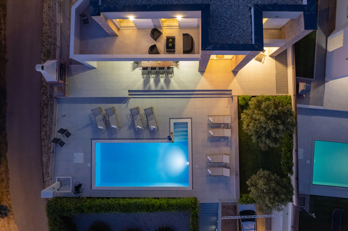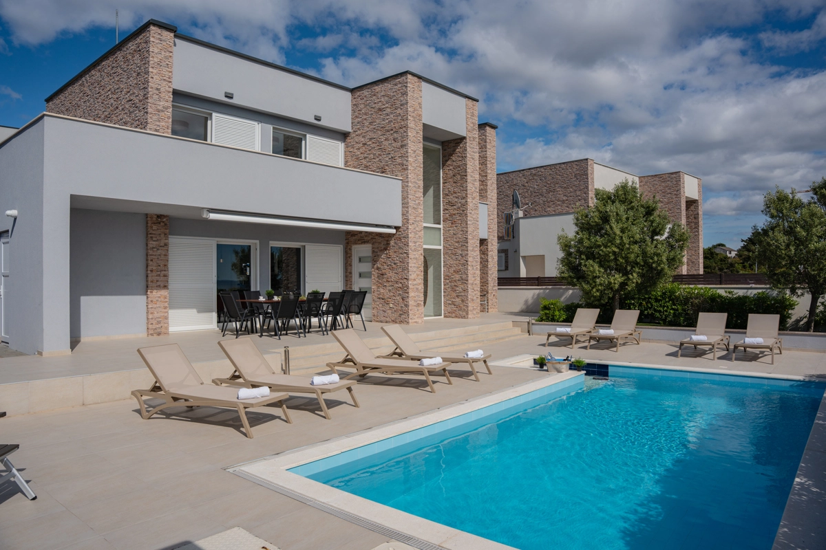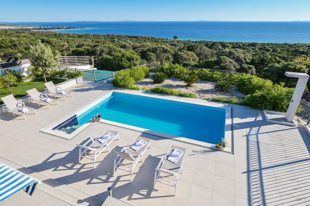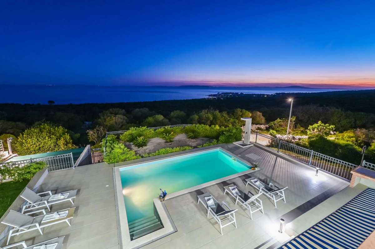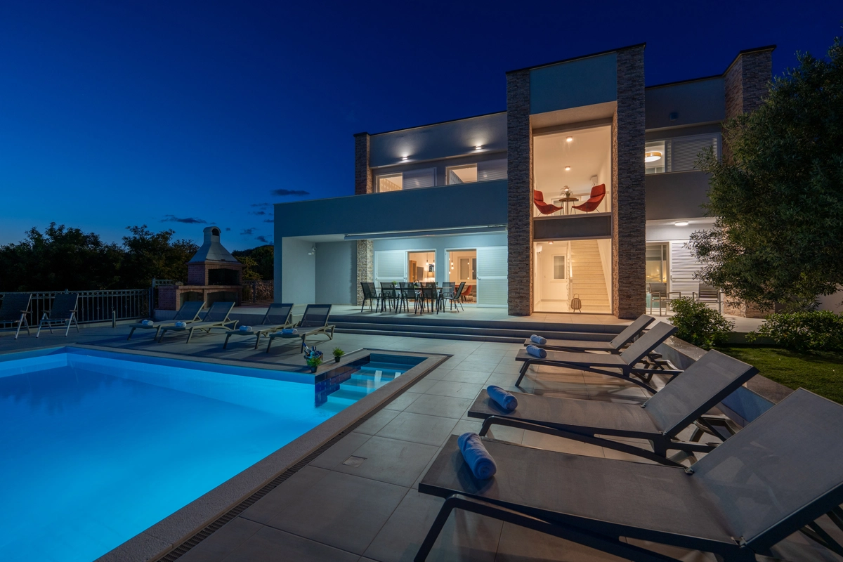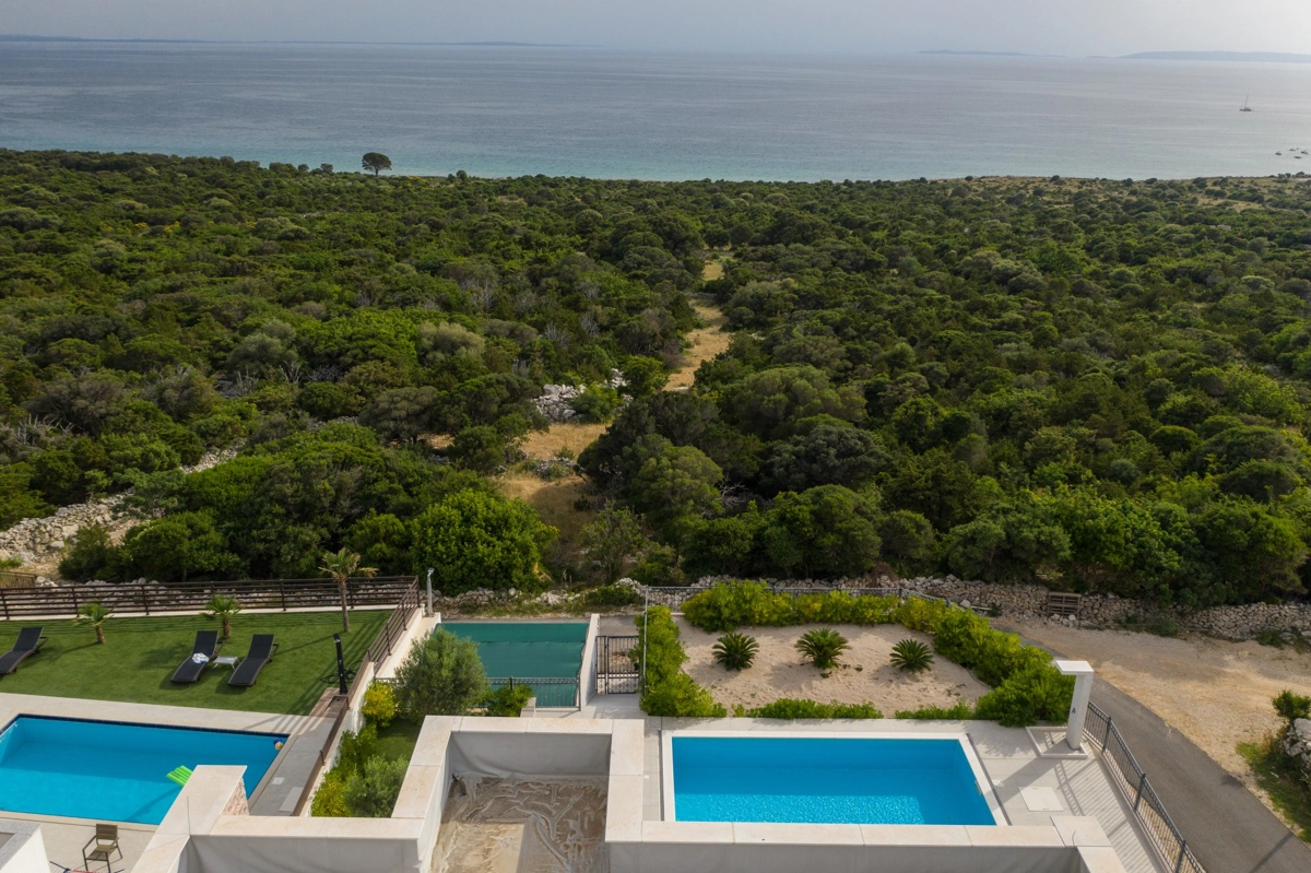 Se volete godervi il lusso e il comfort, Villas Royal sono la scelta giusta per voi. Un bellissimo panorama mozzafiato vi assicurerà una vacanza da ricordare. Villa moderna e superbamente decorata, con una superficie di 200 m2, offre alloggio per otto persone. Ogni villa dispone di quattro camere da letto spaziose, con aria condizionata e balcone. Due sono dotate di letto matrimoniale, mentre le altre due hanno due letti singoli che all'occorrenza possono unirsi. La villa dispone di tre bagni, uno en-suite, mentre tutti i bagni sono dotati di doccia. L'ampio piano terra della villa è fatto in modo open space, il soggiorno moderno è collegato a una cucina completamente attrezzata e sala da pranzo. Il tutto è completato da una splendida vista e dall'accesso diretto ad una spaziosa terrazza con solarium e piscina. Il terrazzo è dotato di una zona pranzo all'aperto con barbecue dove potete rilassarvi in una compagnia piacevole. Il terreno di 600 mq è parzialmente recintato con un muro di pietra o una recinzione metallica e vi fornirà privacy per poter godervi la vostra vacanza senza interruzioni. Avete a disposizione almeno 3 posti auto. La villa è a soli 3,5 chilometri da Novalja e tutto ciò di cui avete bisogno è a portata di mano. Potete divertirvi ballando alla musica dei DJ più famosi del mondo sulla famosa spiaggia di Zrće, bere un cocktail nel trambusto di Novalja o godervi il piacere culinario in un ristorante che nel 2020 ha ottenuto una stella Michelin - ce ne sono tante possibilità!