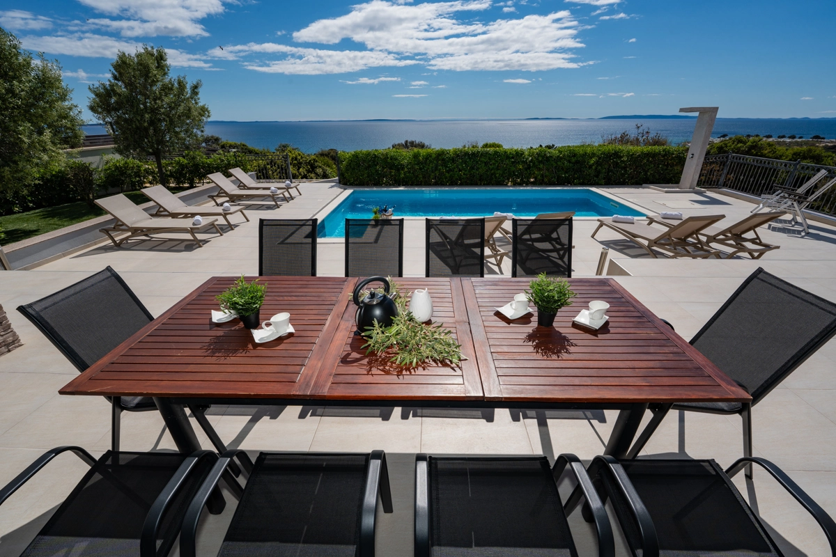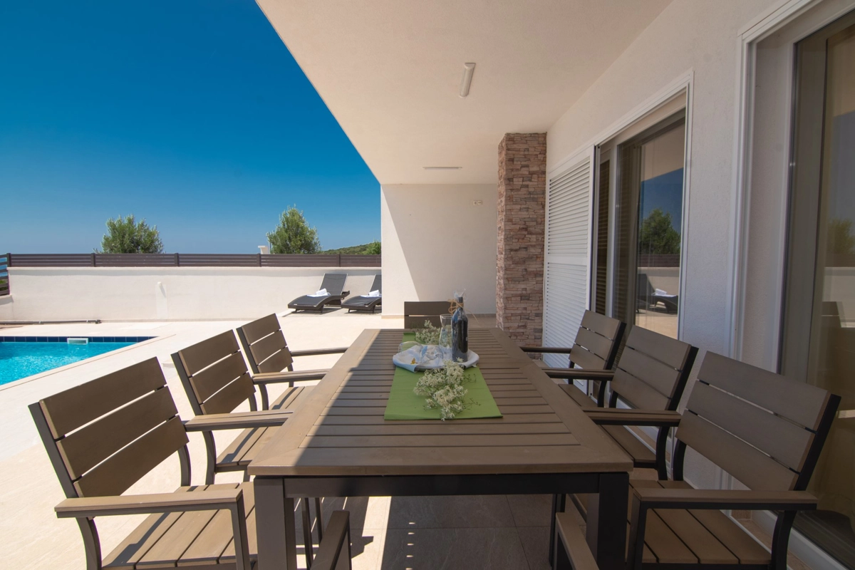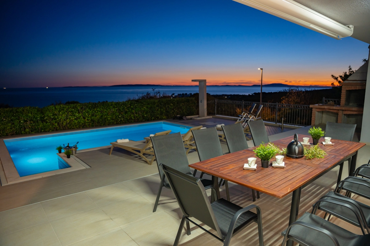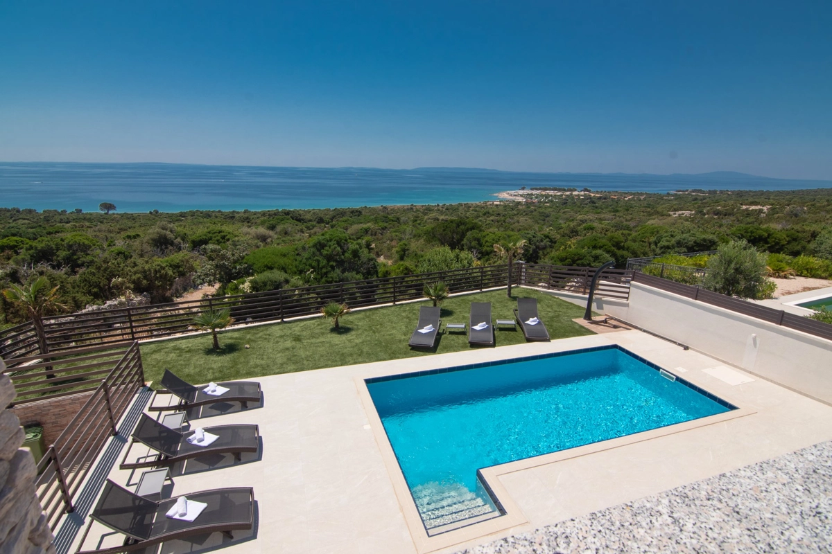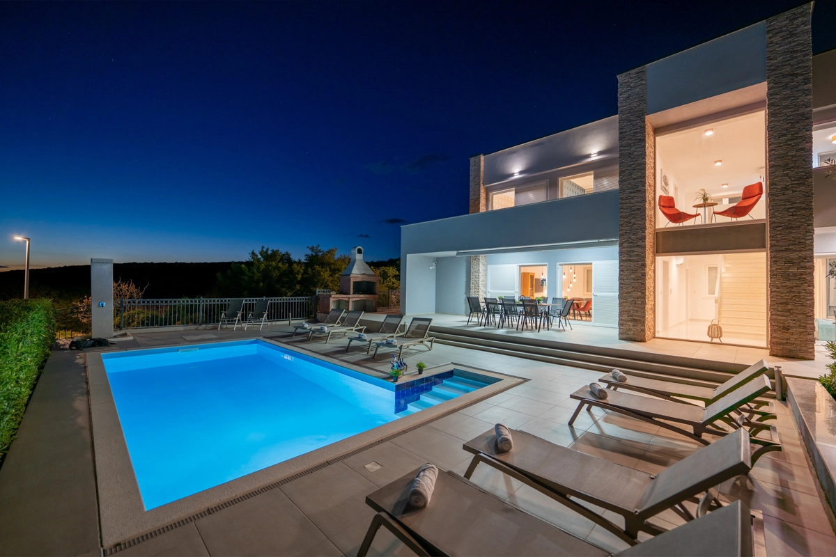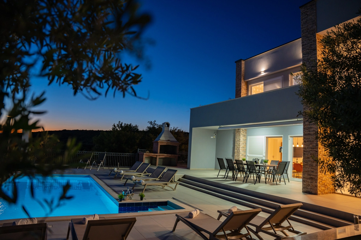 Se volete godervi il lusso e il comfort, Villas Royal sono la scelta giusta per voi. Un bellissimo panorama mozzafiato vi assicurerà una vacanza da ricordare. Villa moderna e superbamente decorata, con una superficie di 200 m2, offre alloggio per otto persone. Ogni villa dispone di quattro camere da letto spaziose, con aria condizionata e balcone. Due sono dotate di letto matrimoniale, mentre le altre due hanno due letti singoli che all'occorrenza possono unirsi. La villa dispone di tre bagni, uno en-suite, mentre tutti i bagni sono dotati di doccia. L'ampio piano terra della villa è fatto in modo open space, il soggiorno moderno è collegato a una cucina completamente attrezzata e sala da pranzo. Il tutto è completato da una splendida vista e dall'accesso diretto ad una spaziosa terrazza con solarium e piscina. Il terrazzo è dotato di una zona pranzo all'aperto con barbecue dove potete rilassarvi in una compagnia piacevole. Il terreno di 600 mq è parzialmente recintato con un muro di pietra o una recinzione metallica e vi fornirà privacy per poter godervi la vostra vacanza senza interruzioni. Avete a disposizione almeno 3 posti auto. La villa è a soli 3,5 chilometri da Novalja e tutto ciò di cui avete bisogno è a portata di mano. Potete divertirvi ballando alla musica dei DJ più famosi del mondo sulla famosa spiaggia di Zrće, bere un cocktail nel trambusto di Novalja o godervi il piacere culinario in un ristorante che nel 2020 ha ottenuto una stella Michelin - ce ne sono tante possibilità!