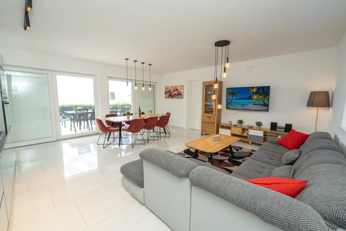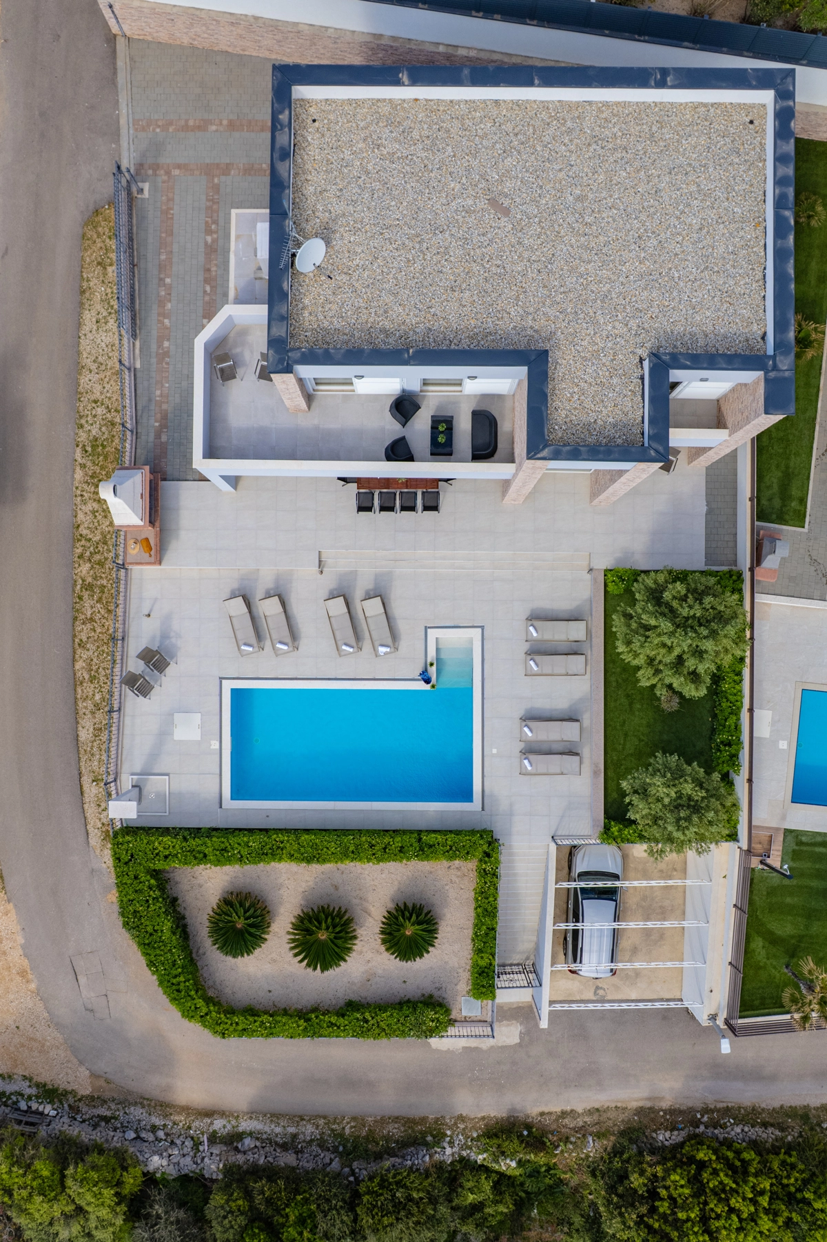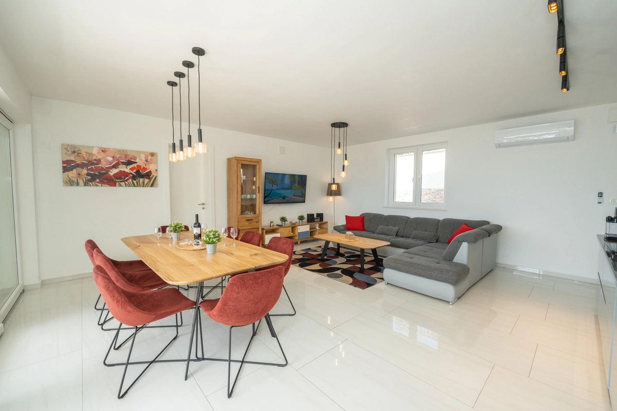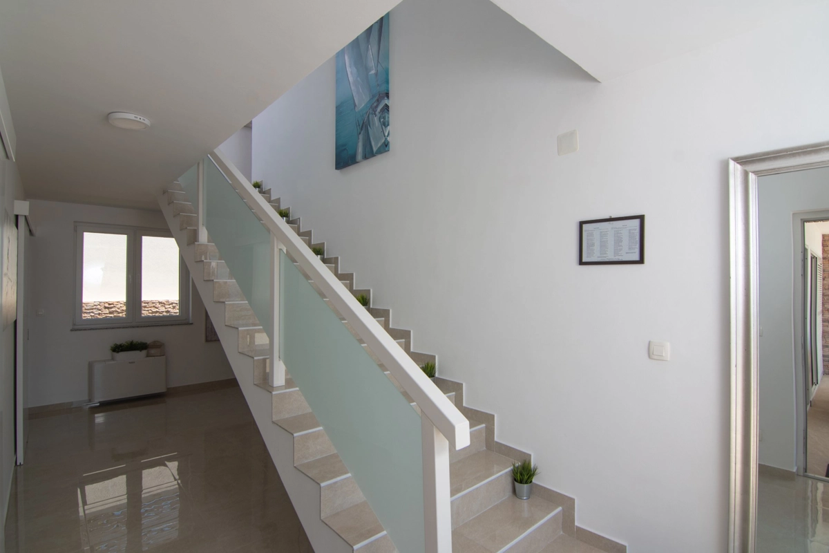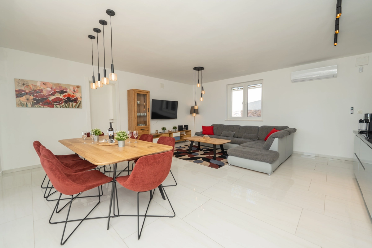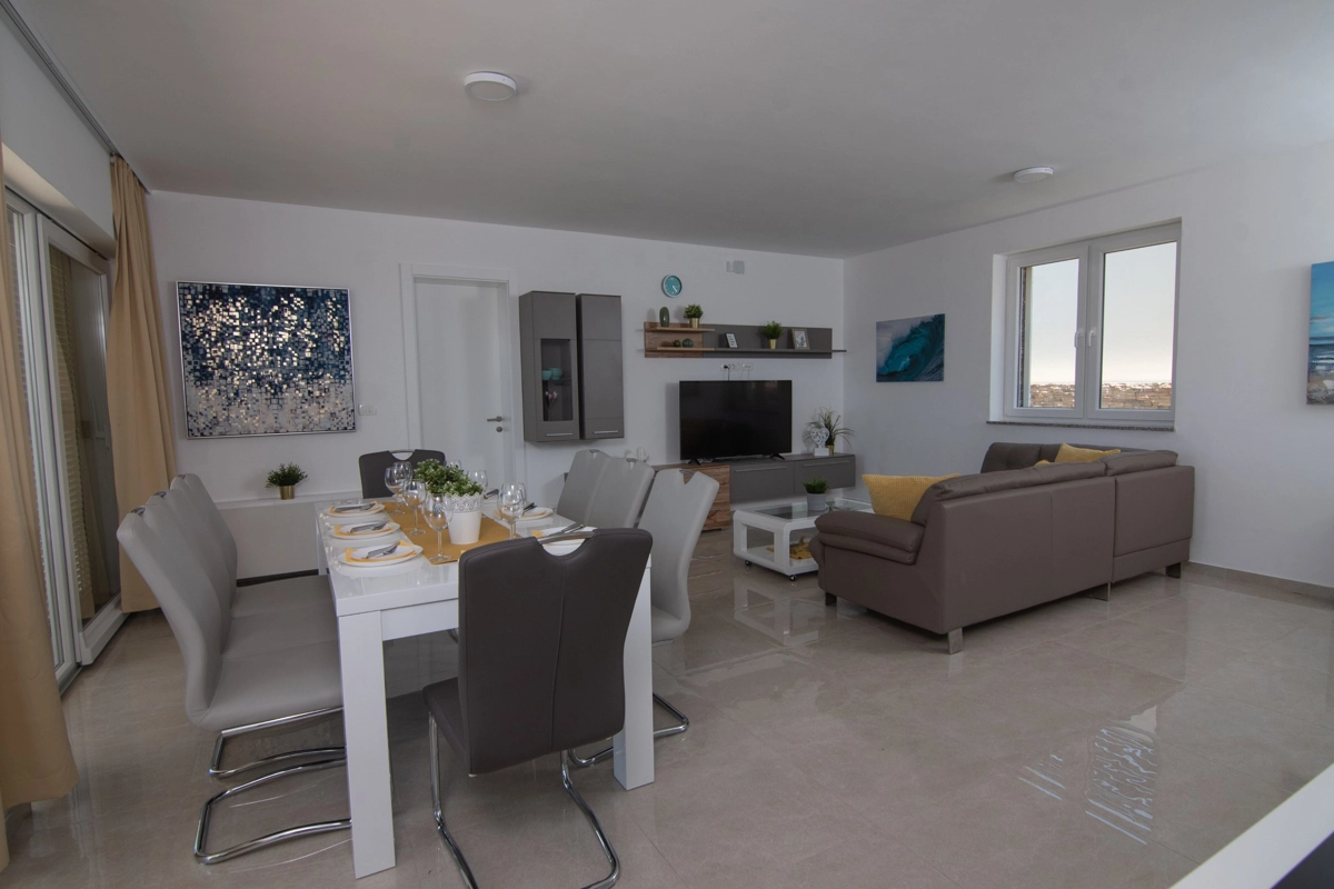 Se volete godervi il lusso e il comfort, Villas Royal sono la scelta giusta per voi. Un bellissimo panorama mozzafiato vi assicurerà una vacanza da ricordare. Villa moderna e superbamente decorata, con una superficie di 200 m2, offre alloggio per otto persone. Ogni villa dispone di quattro camere da letto spaziose, con aria condizionata e balcone. Due sono dotate di letto matrimoniale, mentre le altre due hanno due letti singoli che all'occorrenza possono unirsi. La villa dispone di tre bagni, uno en-suite, mentre tutti i bagni sono dotati di doccia. L'ampio piano terra della villa è fatto in modo open space, il soggiorno moderno è collegato a una cucina completamente attrezzata e sala da pranzo. Il tutto è completato da una splendida vista e dall'accesso diretto ad una spaziosa terrazza con solarium e piscina. Il terrazzo è dotato di una zona pranzo all'aperto con barbecue dove potete rilassarvi in una compagnia piacevole. Il terreno di 600 mq è parzialmente recintato con un muro di pietra o una recinzione metallica e vi fornirà privacy per poter godervi la vostra vacanza senza interruzioni. Avete a disposizione almeno 3 posti auto. La villa è a soli 3,5 chilometri da Novalja e tutto ciò di cui avete bisogno è a portata di mano. Potete divertirvi ballando alla musica dei DJ più famosi del mondo sulla famosa spiaggia di Zrće, bere un cocktail nel trambusto di Novalja o godervi il piacere culinario in un ristorante che nel 2020 ha ottenuto una stella Michelin - ce ne sono tante possibilità!