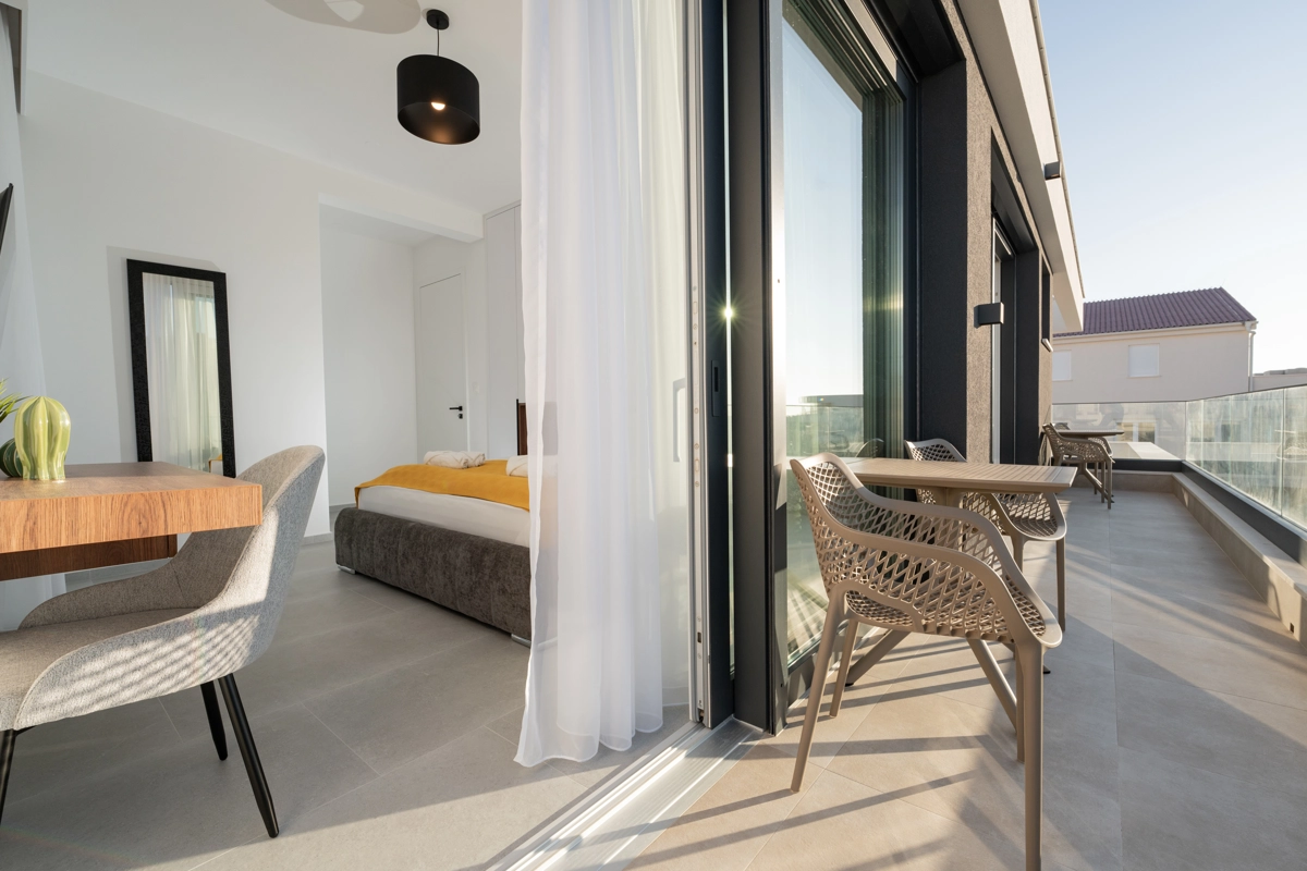 The beach is around 600 m away, the city centre about 500 m, the supermarket roughly 400 m, and the Zrće bus stop around 300 m. The location gives a very strong balance of privacy and convenience.