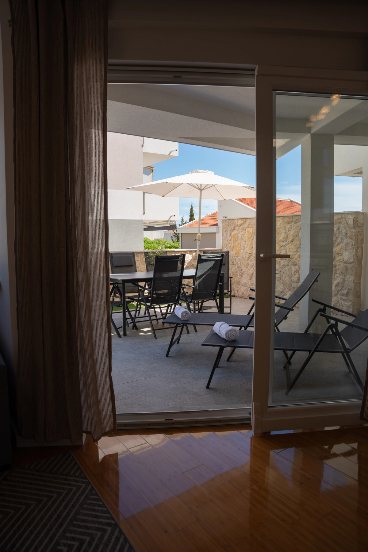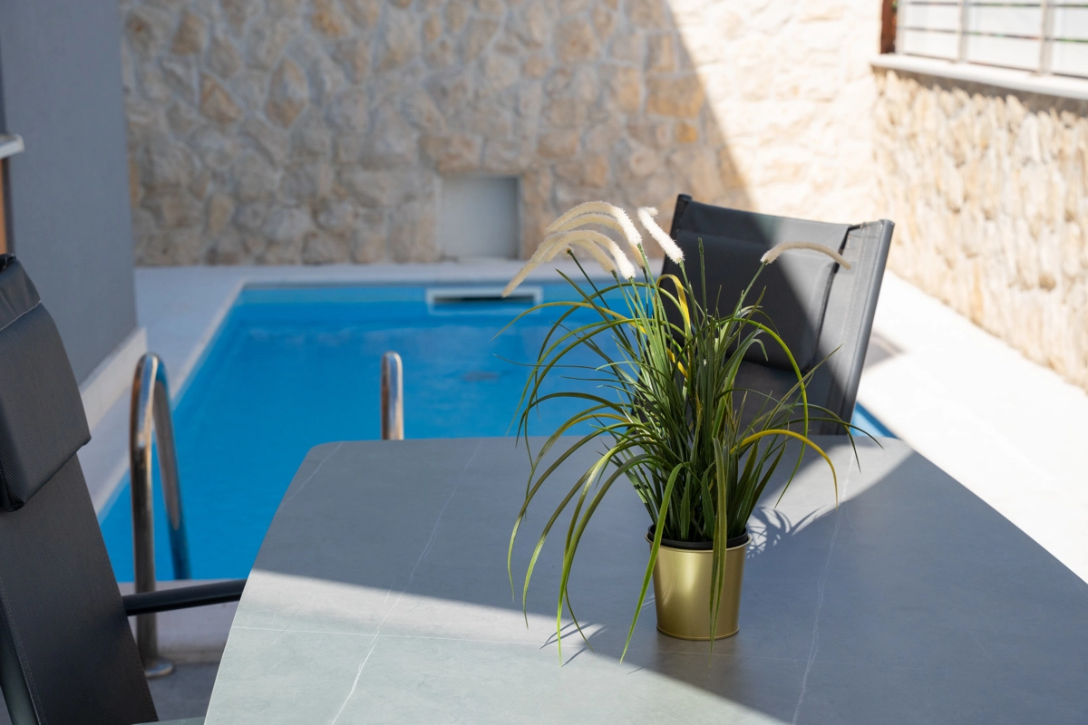 Step outside onto your private patio with a private pool and enjoy the sun rays on your private sun beds.