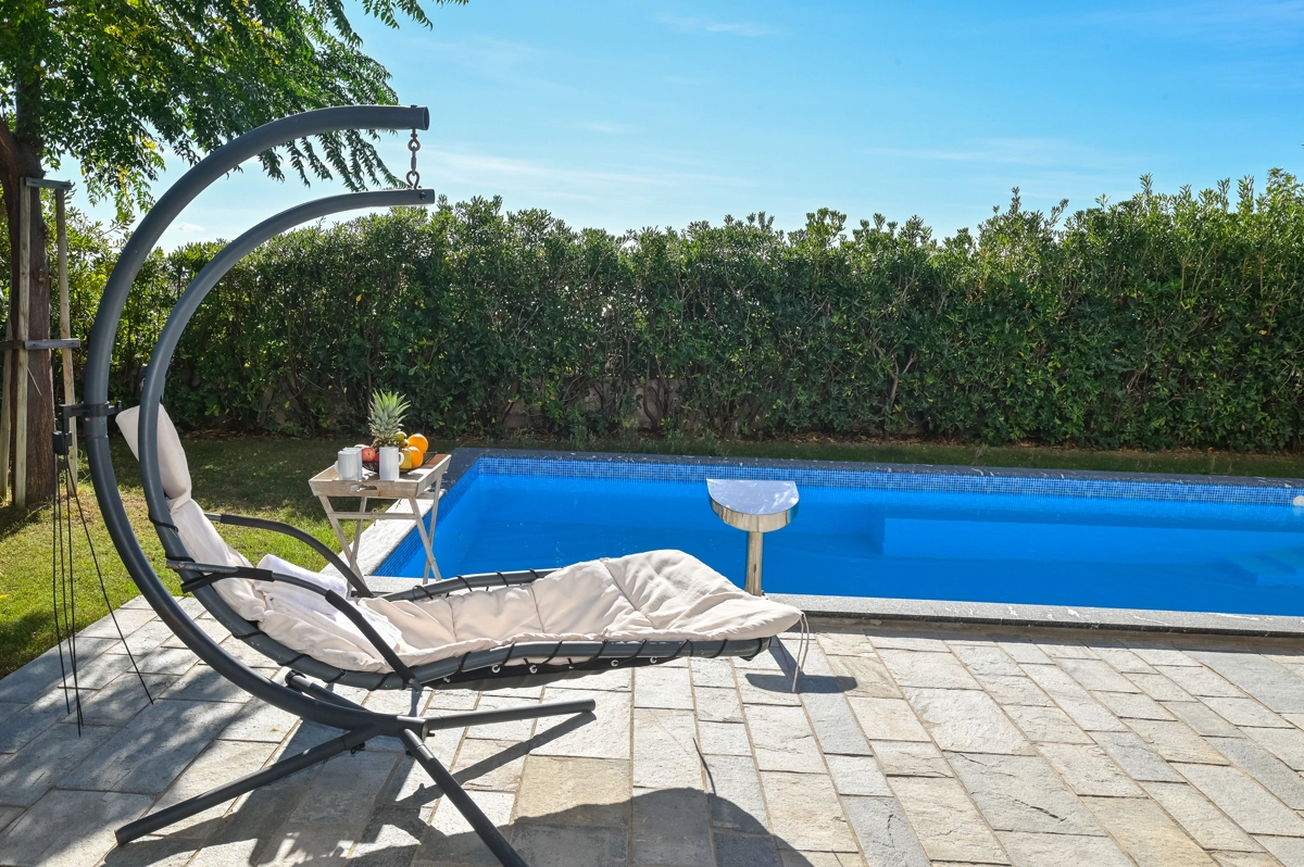 Both villas consist of two floors. The ground floor is an open space. Fully equipped kitchen, a dining area, and a living room overlooking the pool area. The property's highlight is the pool and loungers surrounded by a garden. There is also an outdoor kitchenette and BBQ to enjoy yourself with your friends and family.